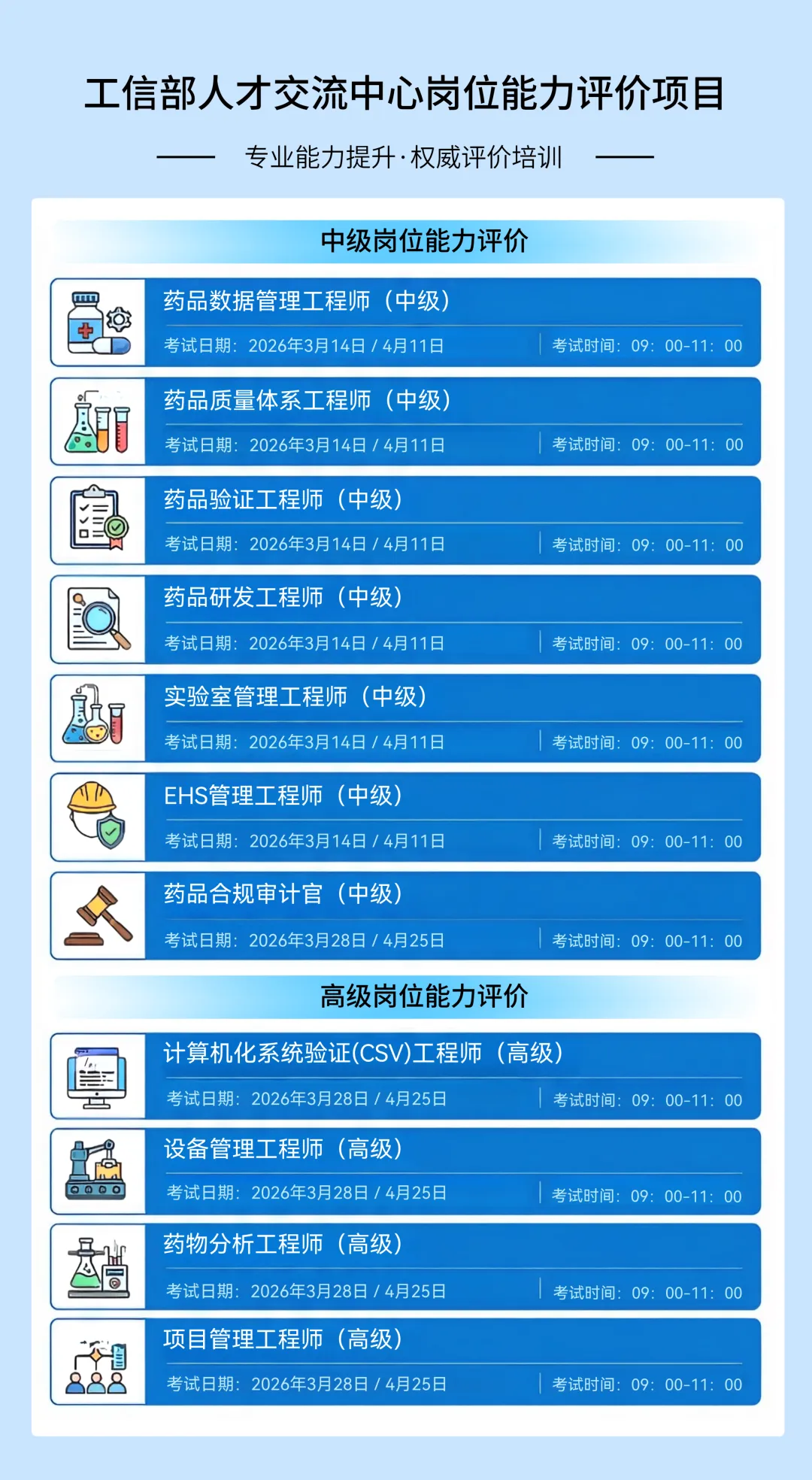 药品类:药品合规审计官、质量体系工程师、生产技术工程师、数据管理工程师、验证工程师、EHS管理工程师、计算机化系统验证(CSV)工程师、药物分析工程师、项目管理工程师等专项能力认证;