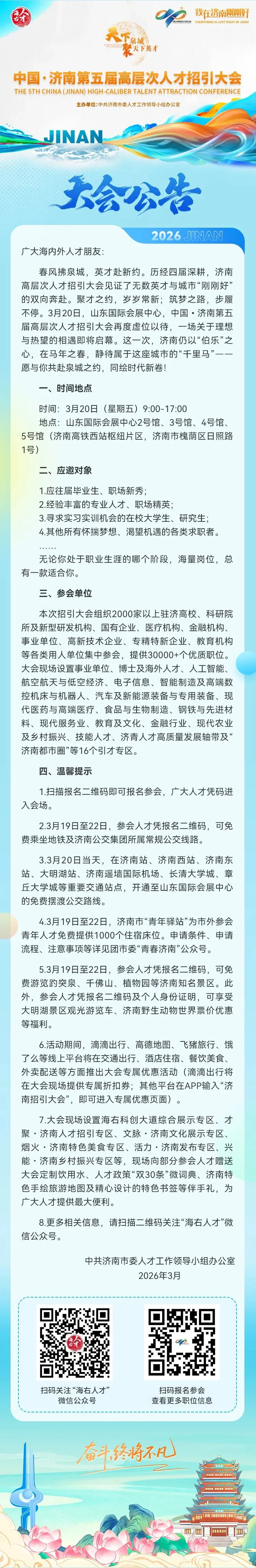 3月20日,“天下泉城聚天下英才”中国·济南第五届高层次人才招引大会将在山东国际会展中心启幕。