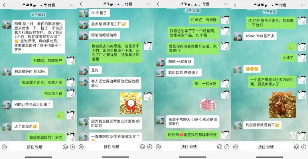 徒弟说,“感恩师父,挖到一个大客户,20个柜,利润 30%(一百三四十万),重点我还不是工厂,纯贸易,感恩遇见,一起发财”