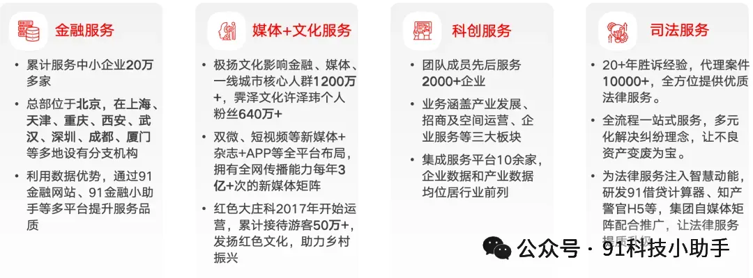 91科技集团将科技创新和产业创新深度融合,目前已形成金融服务、媒体+文化服务、科创服务、司法服务四大业务板块的综合性科技企业。