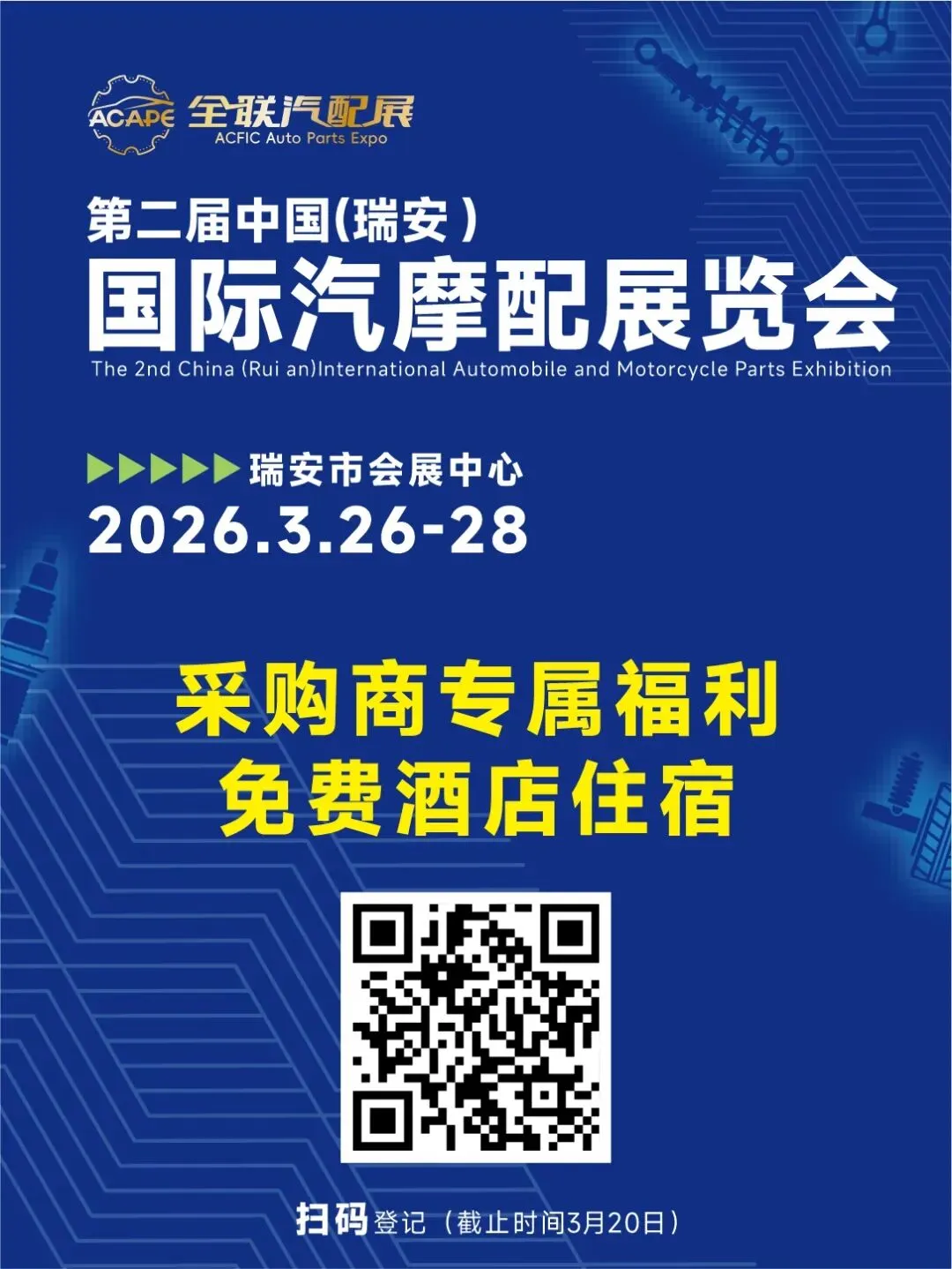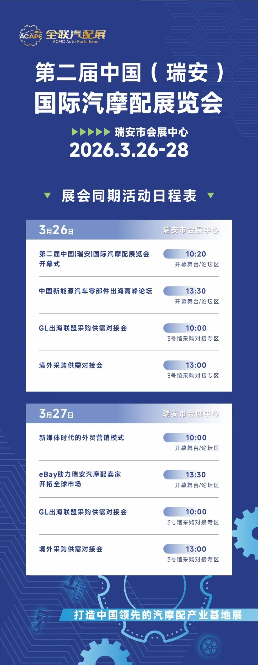 盛会将启,共赴新程。第二届中国(瑞安)国际汽摩配展览会不仅是一场技术与产品的视觉盛宴,更是一场汇聚商机、融通全球的行业盛会。诚邀广大海内外客商莅临瑞安市会展中心,携手共进,共赢未来!