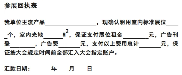 2.参展企业收到“展位确认书”一周内将参展费用汇至我司账户,并将汇款底单回传至我司。