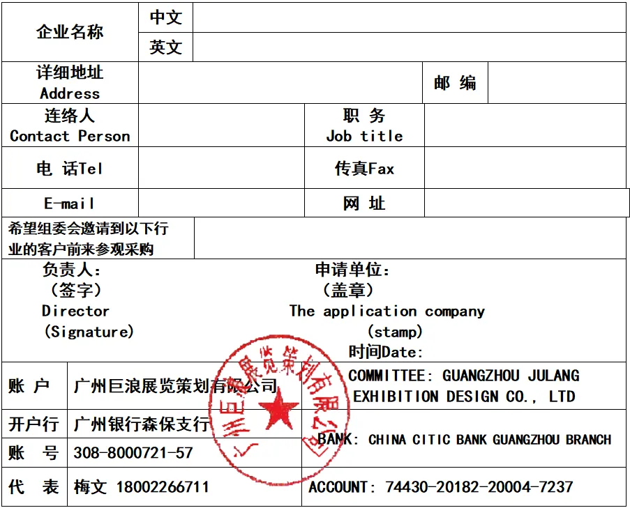 备注:本表仅为企业申请报名所用,正式展位必须在报名三天内,汇出参展费用并传真银行汇款单后,我司回传展位确定书为准,否则,展位给予撤销。