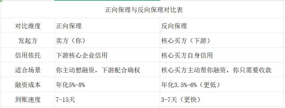 一句话总结:- 你主动要钱,下游配合:选正向保理;- 核心买方帮你融资:选反向保理,成本更低、到账更快。