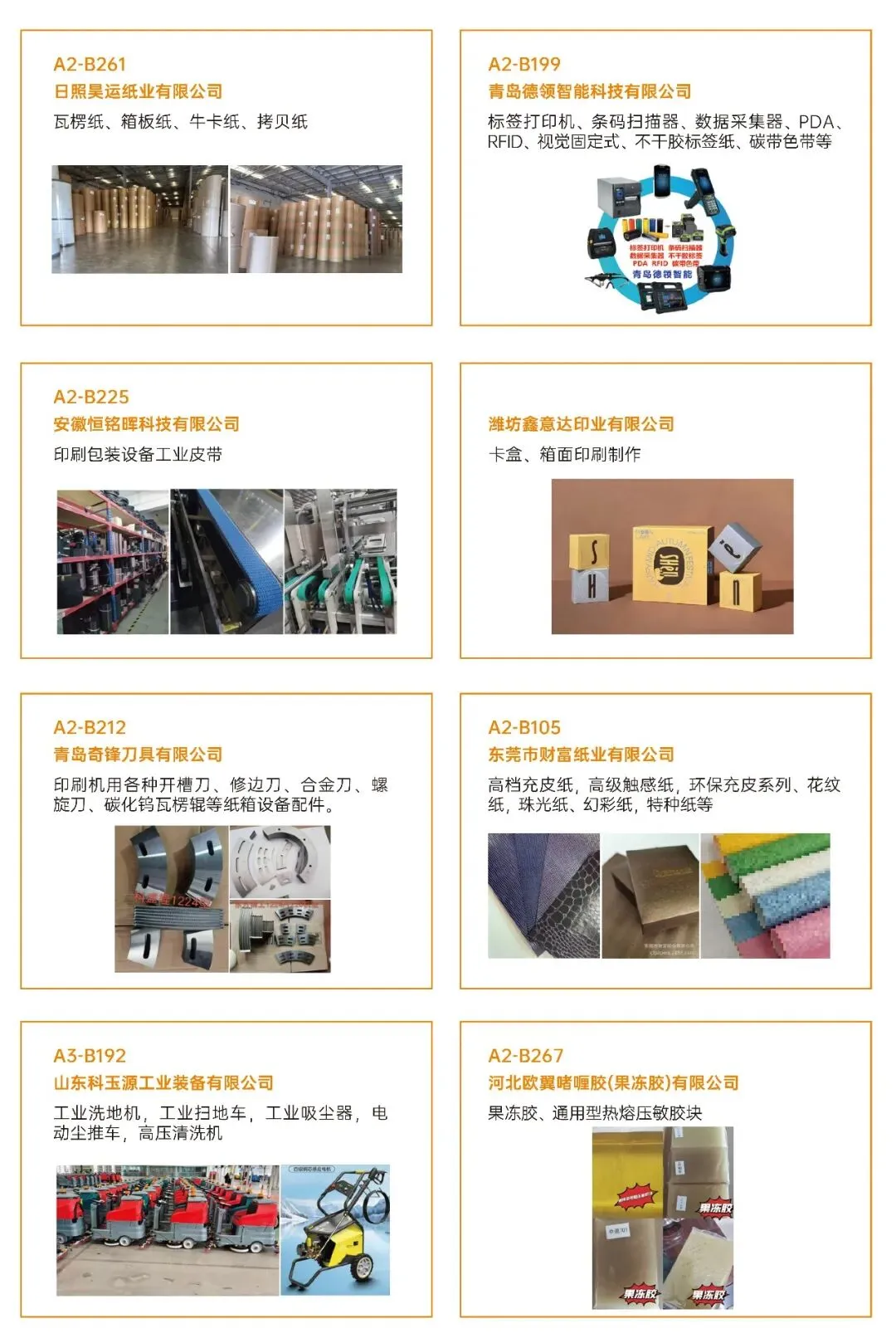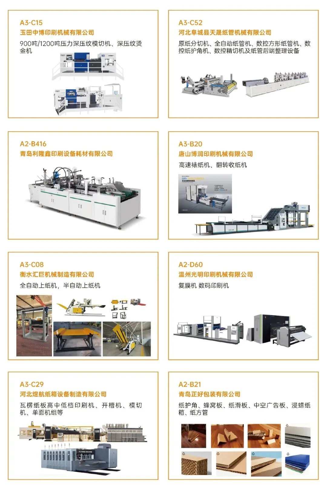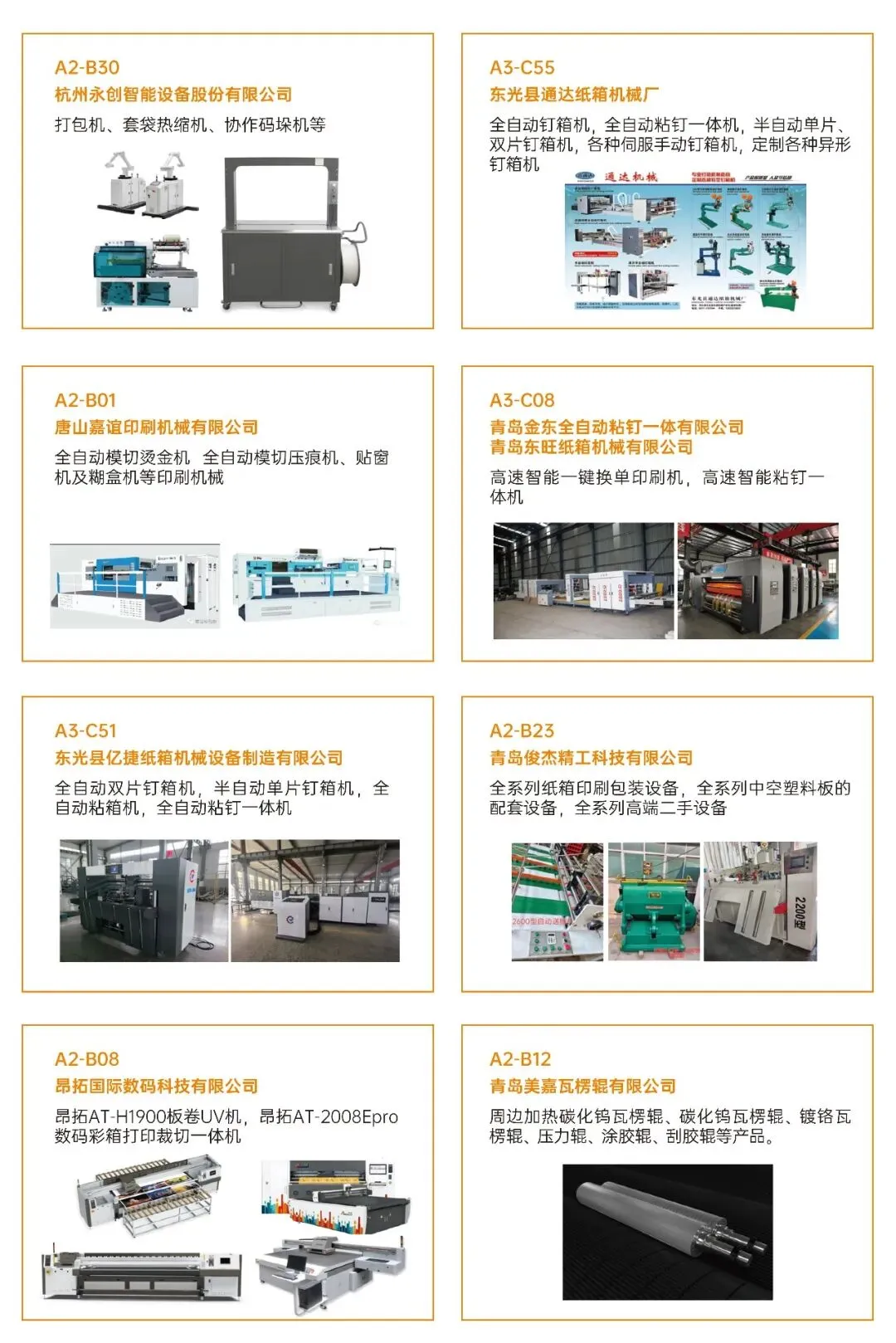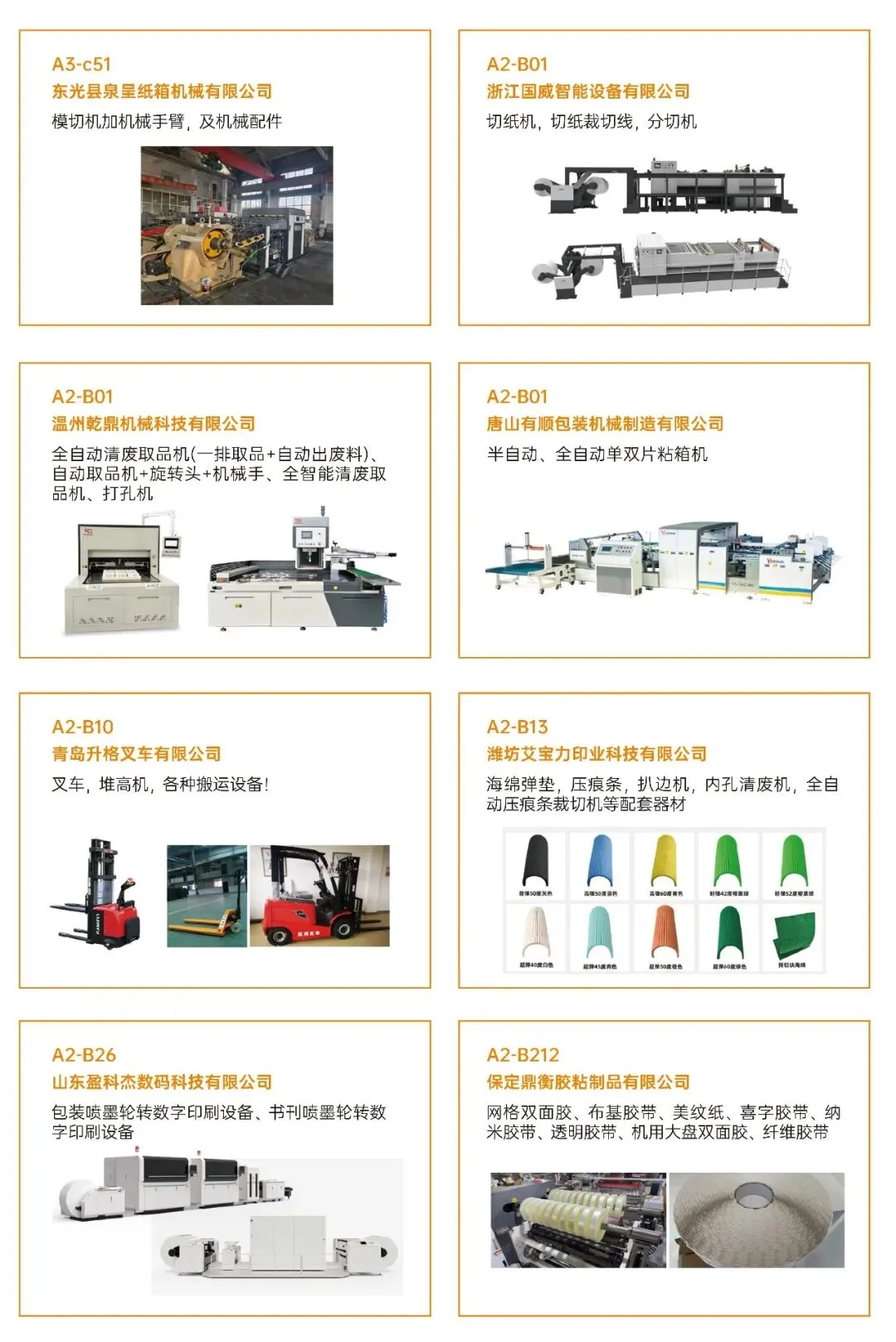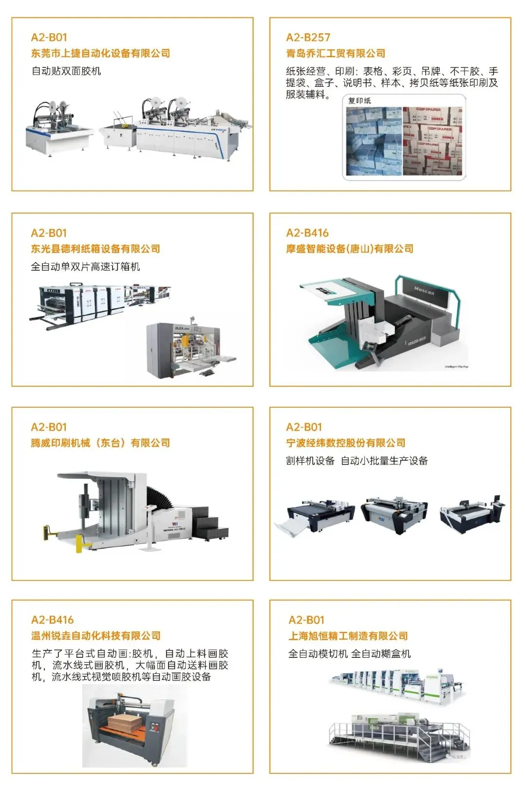 ·智能包装机械:模切机、糊盒机、裱纸机、燙金机、激光切割机、贴窗机、上胶机、纸袋加工设备、胶盒加工设备、纸面处理设备、纸杯/纸盒自动生产线、喷胶系统、编码和识别系统。