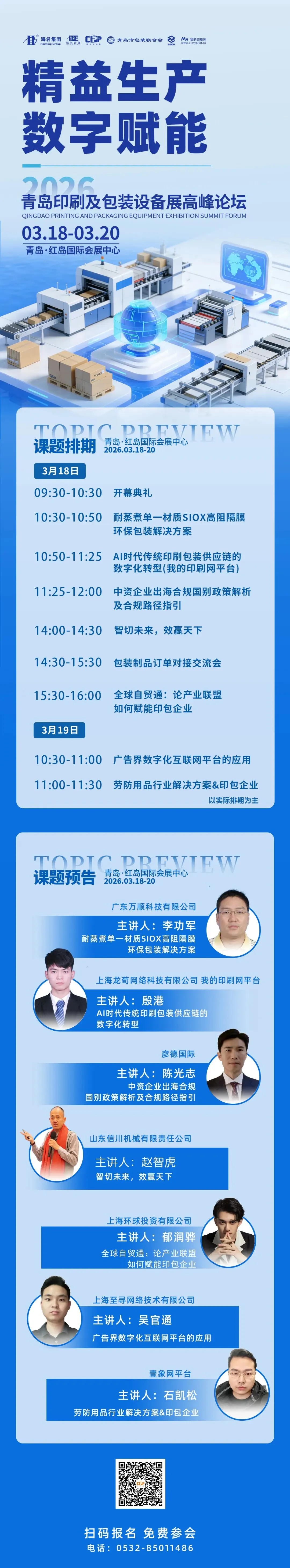 春潮涌动启新程,智印赋能向未来!2026海名·第四届青岛国际印刷及包装设备展览会已正式拉开帷幕,这里有前沿的技术、优质的产品、精准的商机、资深的同行。无论你是寻求设备升级、材料采购,还是想要对接资源、洞察趋势,都能在这里找到答案。3月18-20日,青岛红岛国际会展中心,我们邀您共赴盛会,共探行业新机,共绘北方印包产业高质量发展的恢弘蓝图!