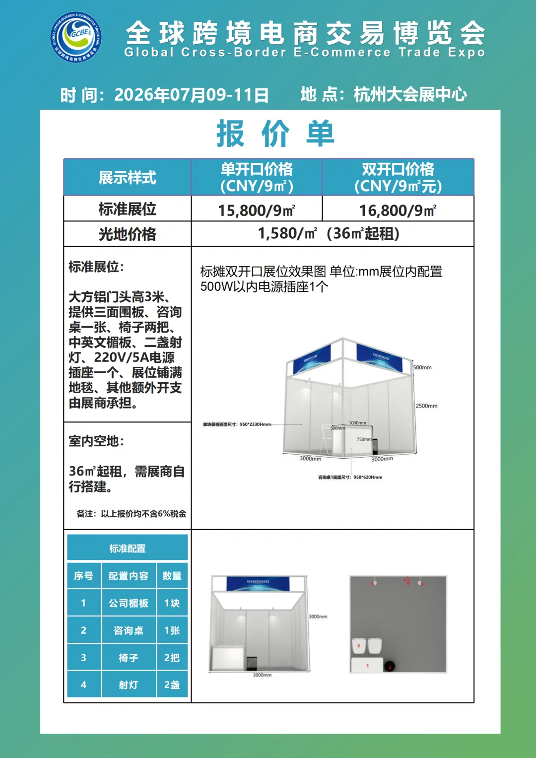 天津市跨境电子商务协会针对企业参加“2026全球跨境电商交易博览会”推出展位优惠方案,助力企业拓展市场、提升品牌影响力。具体优惠方案如下: