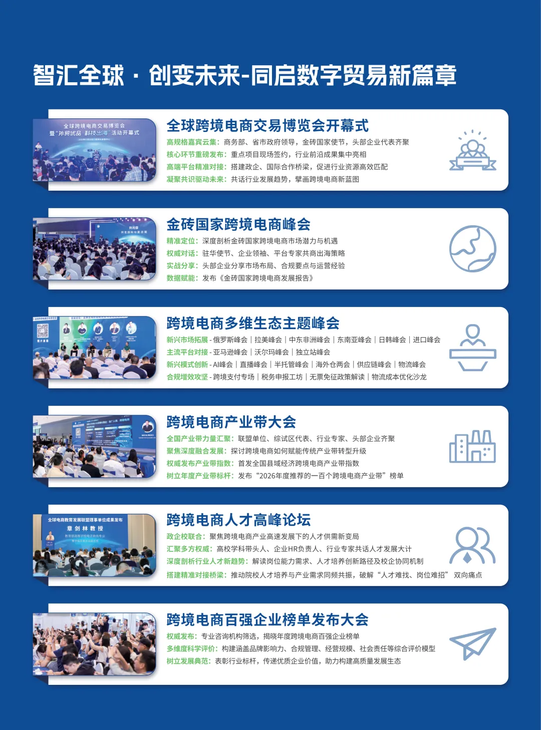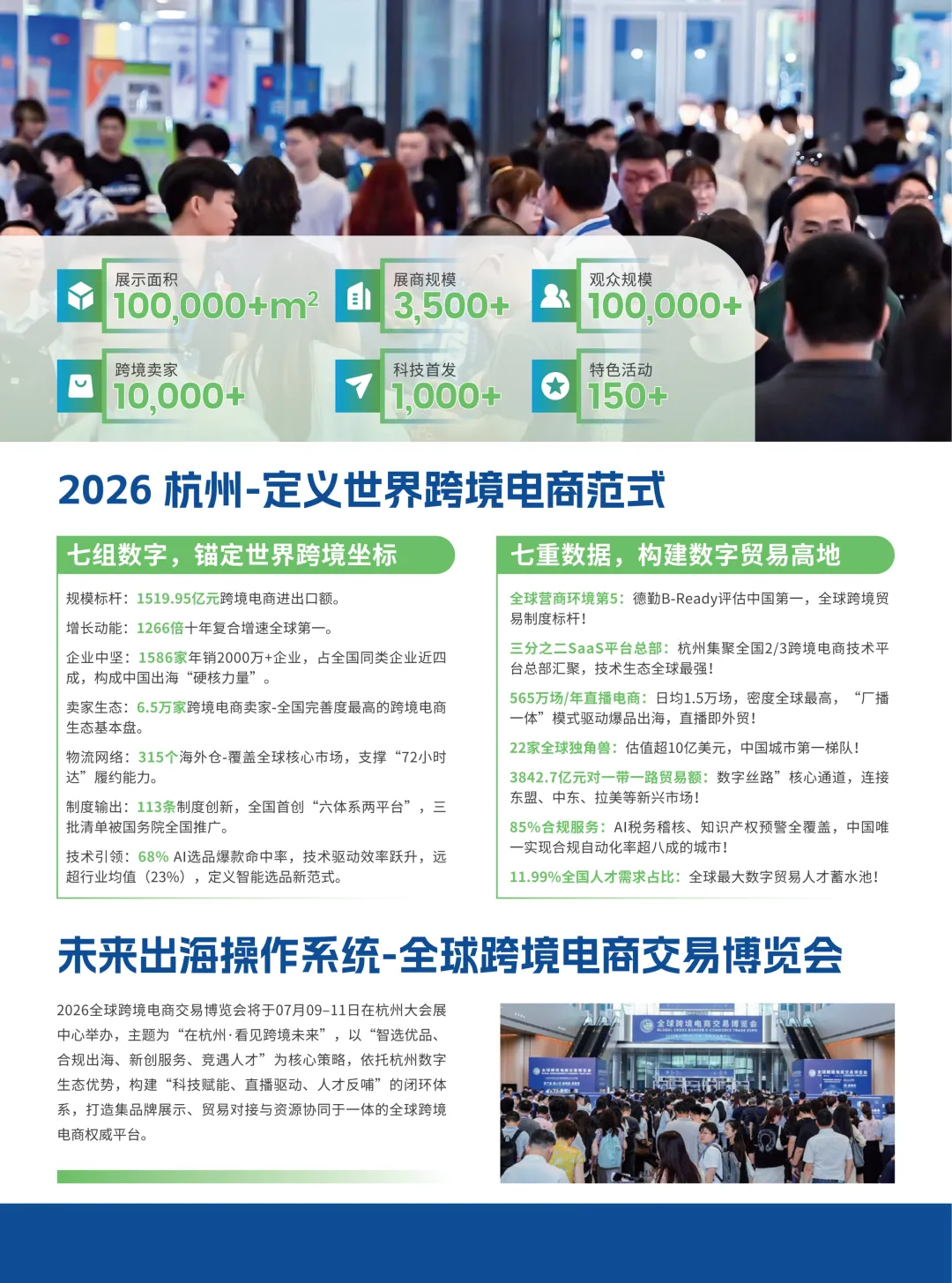 2026全球跨境电商交易博览会(简称:全球跨交会)将于2026年7月9日至11日在杭州大会展中心举行。本次展会聚焦跨境电商全产业链需求,精心打造十大亮点展区,助力企业一站式打通出海通道,抢占全球跨境贸易新机遇。