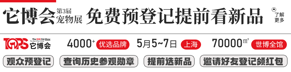 宠物行业观察消息,定位于“中国宠业年度优选平台”的第三届TOPS它博会,即将在5月5日-7日于上海世博展览馆正式举办,届时将迎来800+家参展商、4,000+参展品牌。