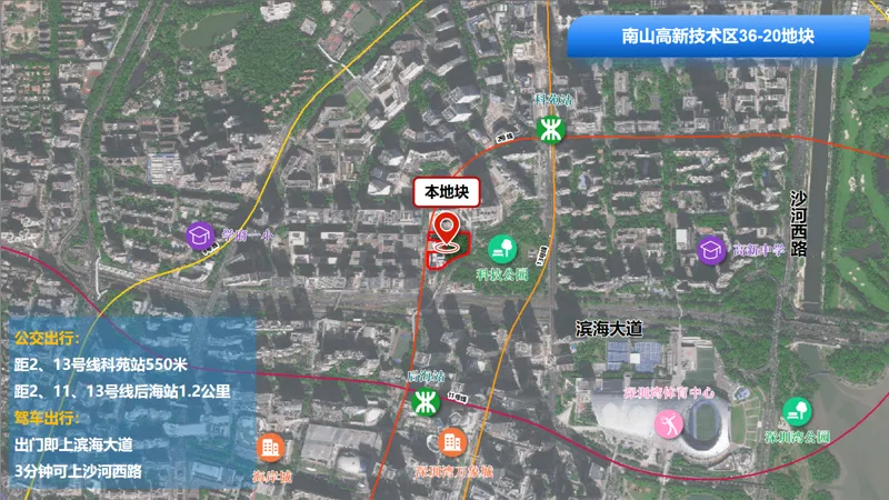 地处科创中轴与滨海大道发展带交汇核心,土地面积约1.41公顷,坐拥双地铁,毗邻深圳湾万象城、深圳湾学校等顶级配套,东接科技公园,是串联教学、创新、居住、商务功能的“无界邻里枢纽”。