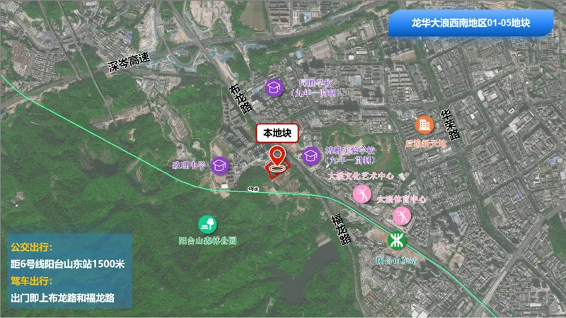 位于龙华大浪片区,土地面积约2.33公顷,交通便利;周边生态资源丰富,背靠阳台山森林公园;配套齐全,有博雅实验学校、大浪体育中心、大浪文化艺术中心等众多公共设施,具备打造低密度、差异化产品的条件。