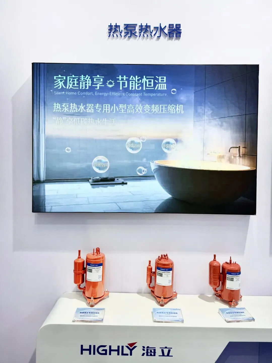 在家庭与商用热水全场景中,运行噪音大、变频波动大、恒温效果差是长期困扰用户的核心痛点。海立本次重磅展出的热泵热水器专用小型高效变频压缩机,以技术突破直击痛点,将“稳定静音”做到行业极致:运行噪音低至38分贝,远低于行业常规标准,实现设备运行“近听无声”;能效比突破行业阈值,较传统压缩机节能20%以上。海立以持续迭代的核心部件技术,让每一台热泵热水设备广泛适配楼盘配套、高端酒店、商业综合体热水系统等多元场景,成为热泵热水领域核心部件的首选方案。
