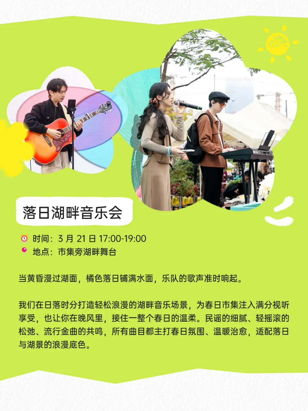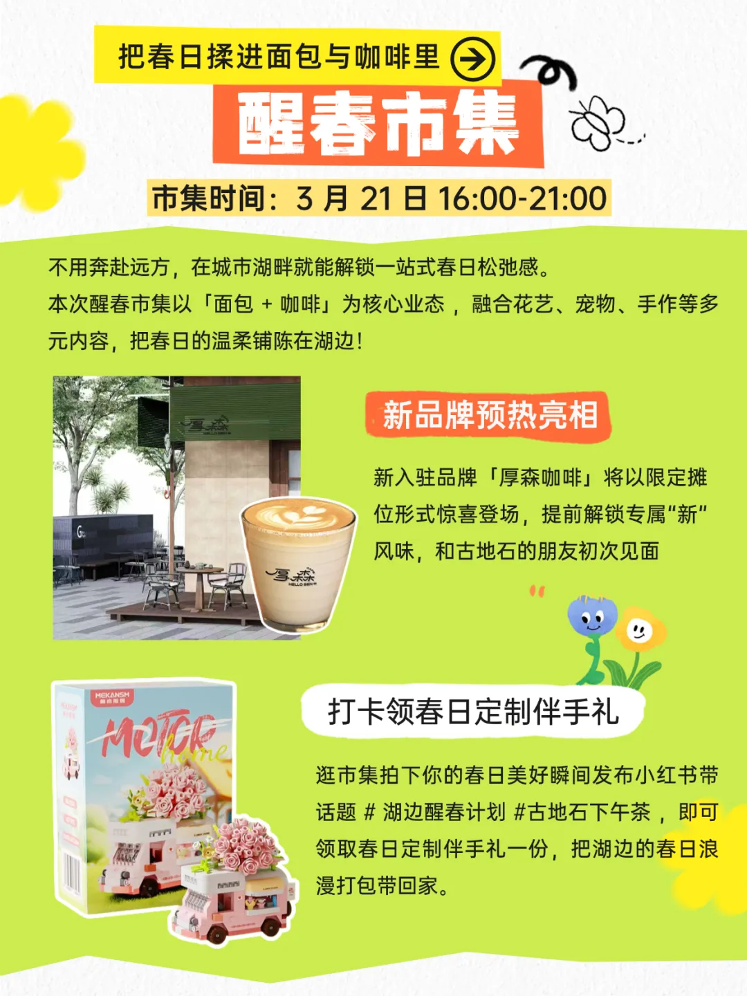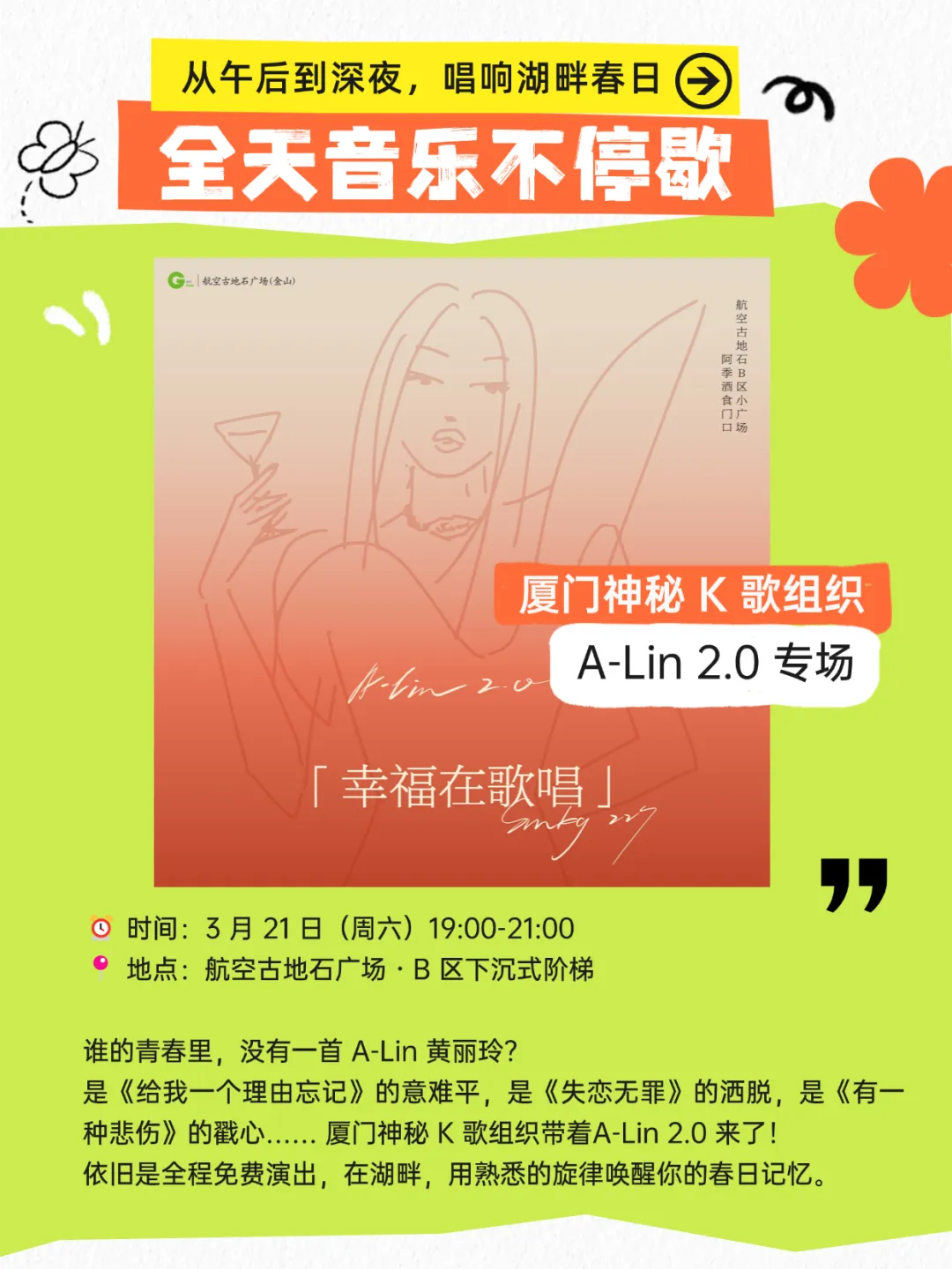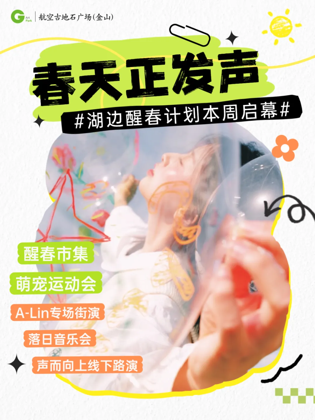 航空古地石广场「湖边醒春计划」,3月21日(周六)正式启幕!从午后到深夜,醒春市集、萌宠运动会、A-Lin专场街演、落日音乐会轮番上演,更有咖啡半价、限定周边、免费摄影福利全线拉满。