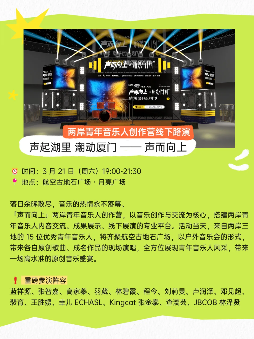 特别惊喜!声而向上×新势力计划2026两岸(厦门)青年音乐人创作营今日已开营!两岸青年音乐人线下路演也将于周六在航空古地石广场·月亮广场与大家见面,众多优秀青年音乐人齐聚湖里,将以户外音乐会的形式,带来各自原创歌曲、成名作品等,别错过这场音乐盛宴!
