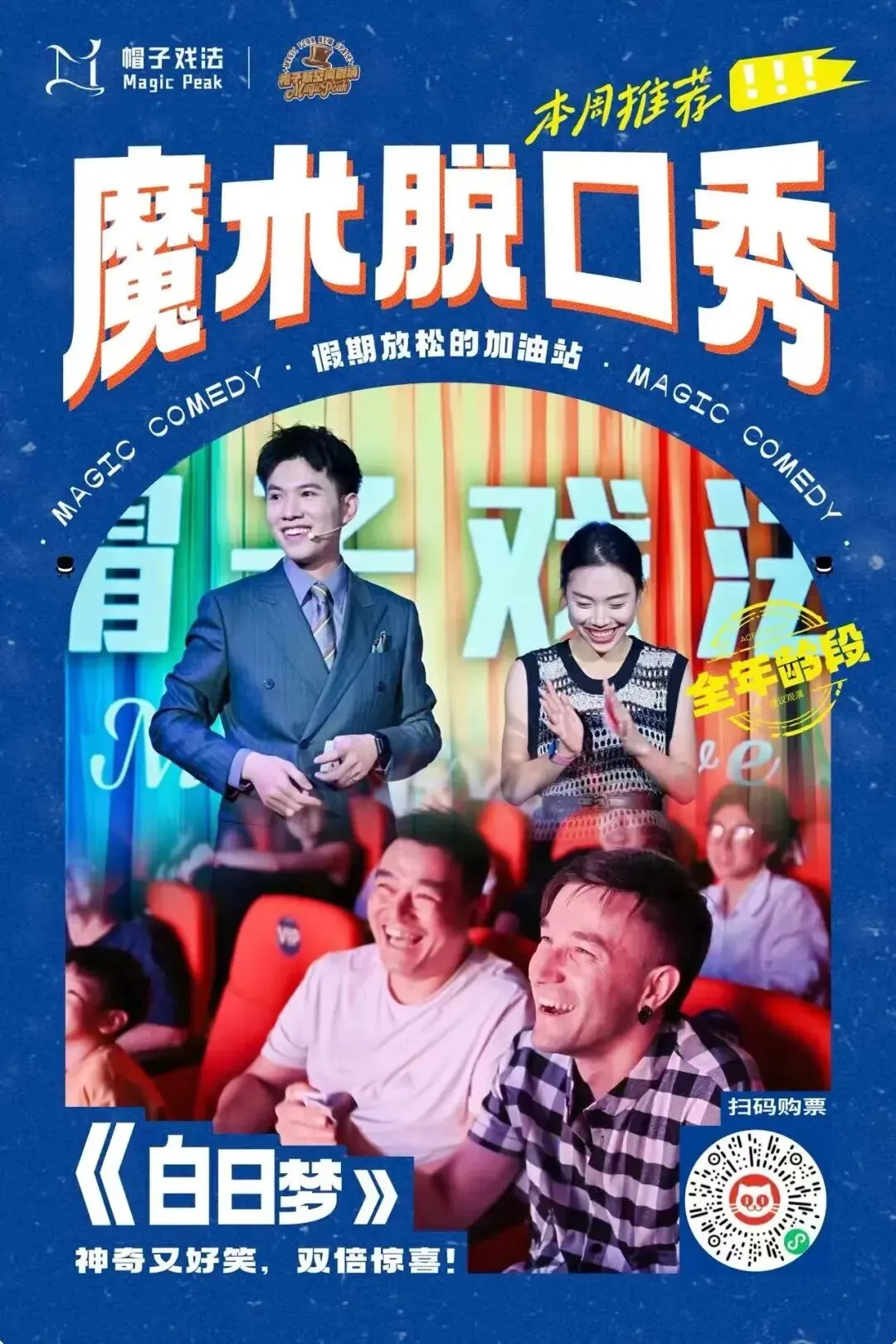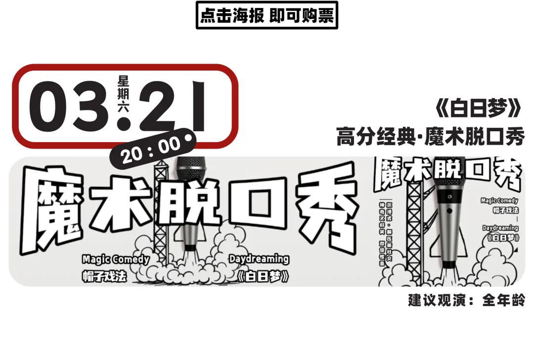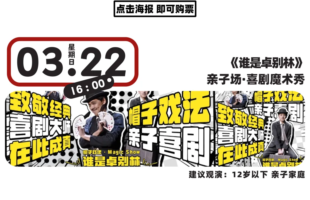魔法盲盒喜剧《疯狂星期X》是一场“随机”的多品类实验喜剧,不定期由本地主咖演员或外地嘉宾的搭配组合呈现。魔术脱口秀《白日梦》既有现场玩梗的爆笑脱口秀互动、又有神奇好笑的创意喜剧魔术,全年龄友好。亲子·喜剧魔术秀《谁是卓别林》将创意魔术和滑稽喜剧巧妙结合,将为你和孩子共创一段神奇又好笑的“卓式幽默”时光。