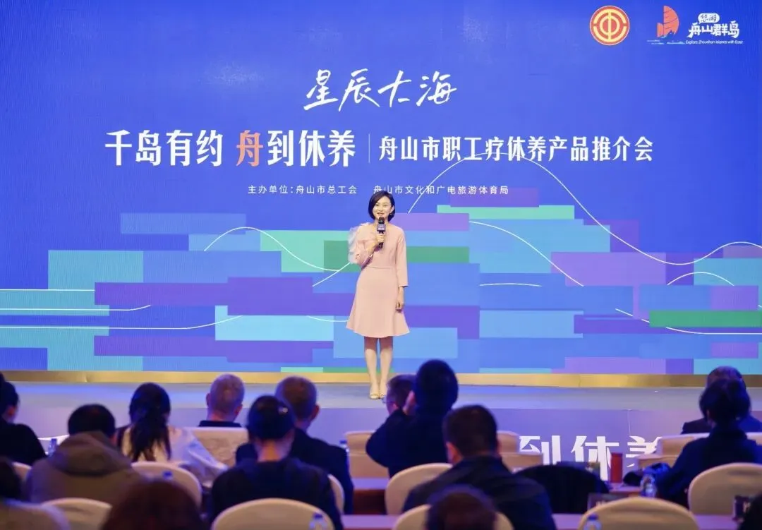 推介会现场,舟山各县(区)、普陀山朱家尖管委会和舟山旅游集团的职工疗休养推介官依次登台,化身“海岛导游”。从普陀山的“心灵朝圣”到朱家尖的“沙雕狂欢”,从金庸笔下的桃花岛到定海的“古城漫步”,从岱山“双合石壁”到嵊泗枸杞岛的“蓝海牧歌”,每一条线路都紧扣“海”字主题,融入了浓郁的渔港风情和清新的生态底色。推介官们通过精美的视频、生动的讲解,将舟山“海天佛国、渔都港城”的独特韵味展现得淋漓尽致,让现场嘉宾仿佛置身于涛声阵阵、海风拂面的群岛之间。