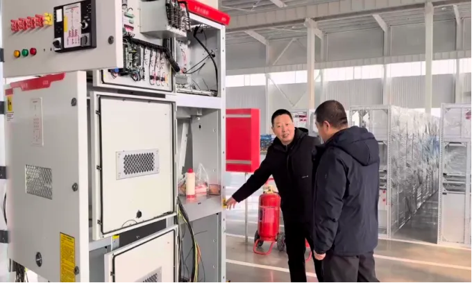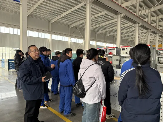 实习第一课从参观厂区开始,宁文军主任化身讲师,绕开枯燥理论,从主营项目切入,带领师生俯瞰现代化生产流程。他结合高低压电器柜生产工序,详解 “一次线”“二次线” 的岗位要点,从识图能力到工艺标准,从安全规范到职业素养,让学生看清工作流程,更明晰未来职业发展路径。