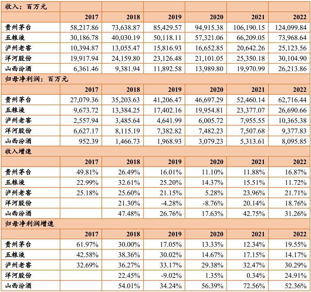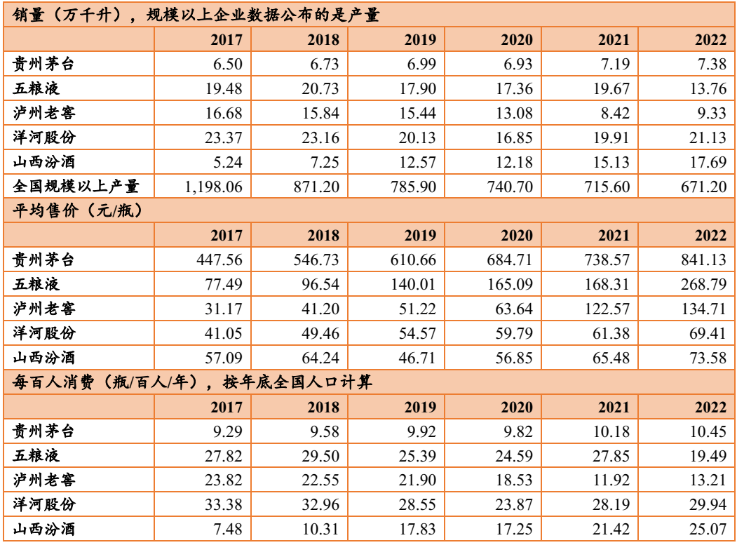 下表中,山西汾酒公布的销量本身就是升,不需要换算单位。销量最高的是洋河,按照(0.92418kg/L)的密度计算,2022年全年销量21万千升,其次是山西汾酒的18万千升,再次是五粮液的14万千升,几家企业中只有五粮液的销量在下跌,根据年报P14,主要是五粮液优化产品结构,向中高价位产品聚焦。平均售价方面(茅台的均价计算包括系列酒),茅台、五粮液、泸州老窖分居前三,各个企业的平均售价都在逐年增长,其中五粮液增长的比率最大(虽然在价格量上跟茅台一样,但是五粮液价格基数低)。