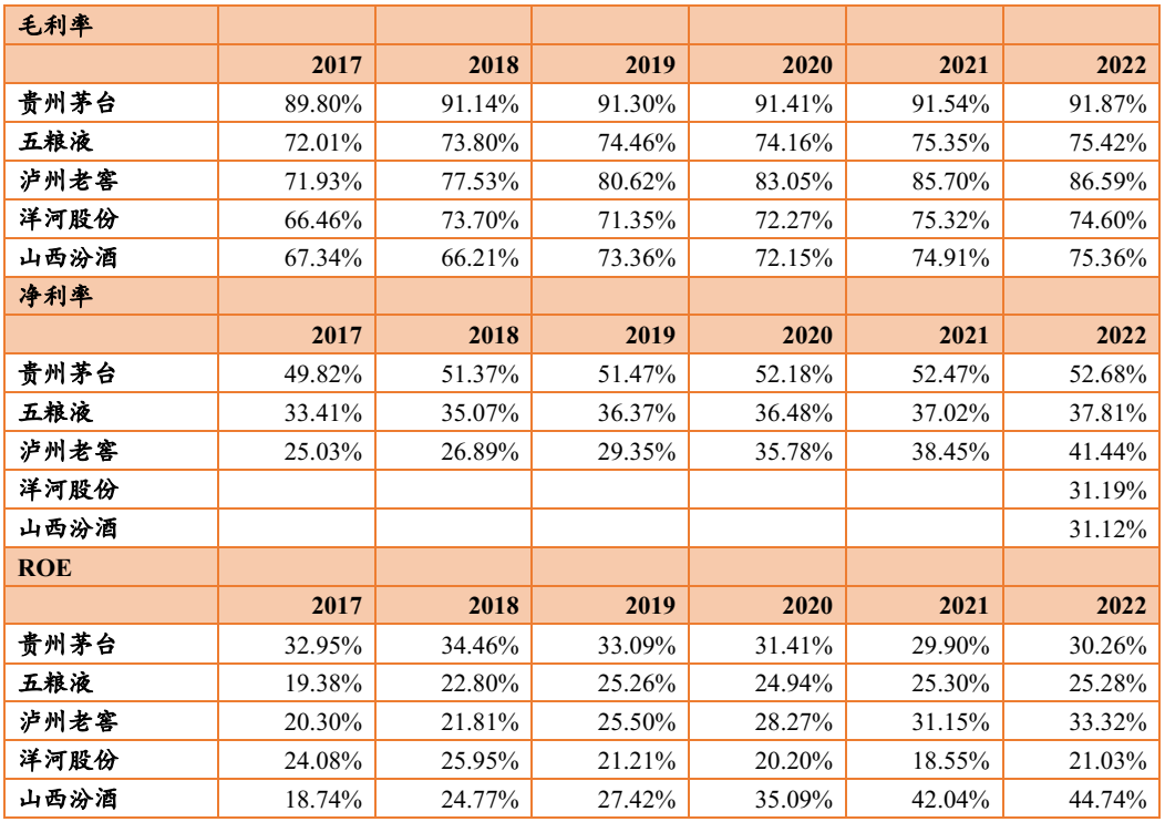 五家企业中,可以分成三个梯队,茅台高处不胜寒,收入就自己破千亿,利润超过600亿;五粮液收入在700亿的位置,利润在250亿以上;其他三家收入在200-300亿的区间,利润在100亿左右。毛利率方面,也是三个梯队,贵州茅台独领风骚,在90%以上;泸州老窖达到85%左右,其他三家处于75%上下。