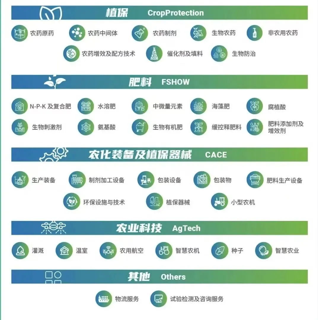 值得注意的是,本届展会亮点纷呈,展会涵盖农药、肥料、农化装备及植保器械、农业科技四大分题展(CropProtection、FSHOW、CACE、AgTech),并细分多个产品与技术领域,全面展示从原药、制剂、新型肥料到智能装备、农业科技的农化全产业链创新成果。