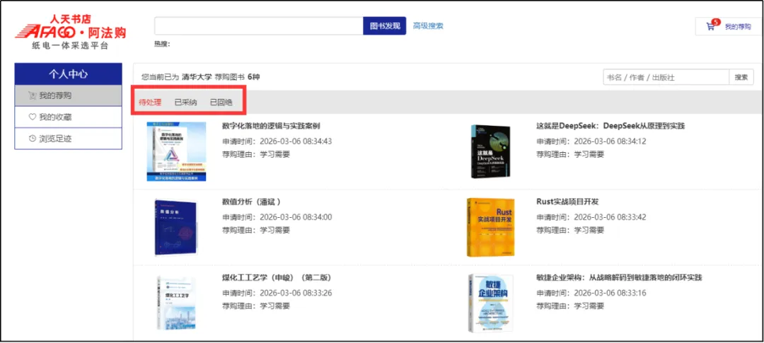 3.我的荐购:【个人中心】→【我的荐购】中,可查看所有的荐购书目,以及图书馆的采纳情况。