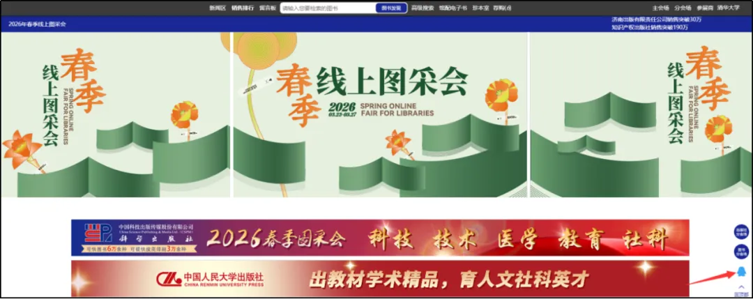 4.销量排行榜:左上角的【销量排行榜】对出版社、图书公司、出版社分类、图书单品销量进行时时榜单排行,可作为读者选书的参考。