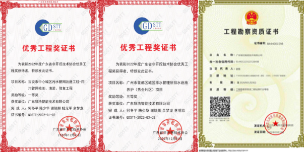 银浩智能拥有市政公用施工总承包二级、测绘乙级资质、CMA检测资质、特种结构补强(不分等级)、环保工程专业承包三级、排水管道非开挖修复作业证、排水管道检测与评估作业证、防水防腐保温工程专业承包二级、建筑装修装饰工程专业承包二级、建筑工程施工总承包三级等多项专业资质。