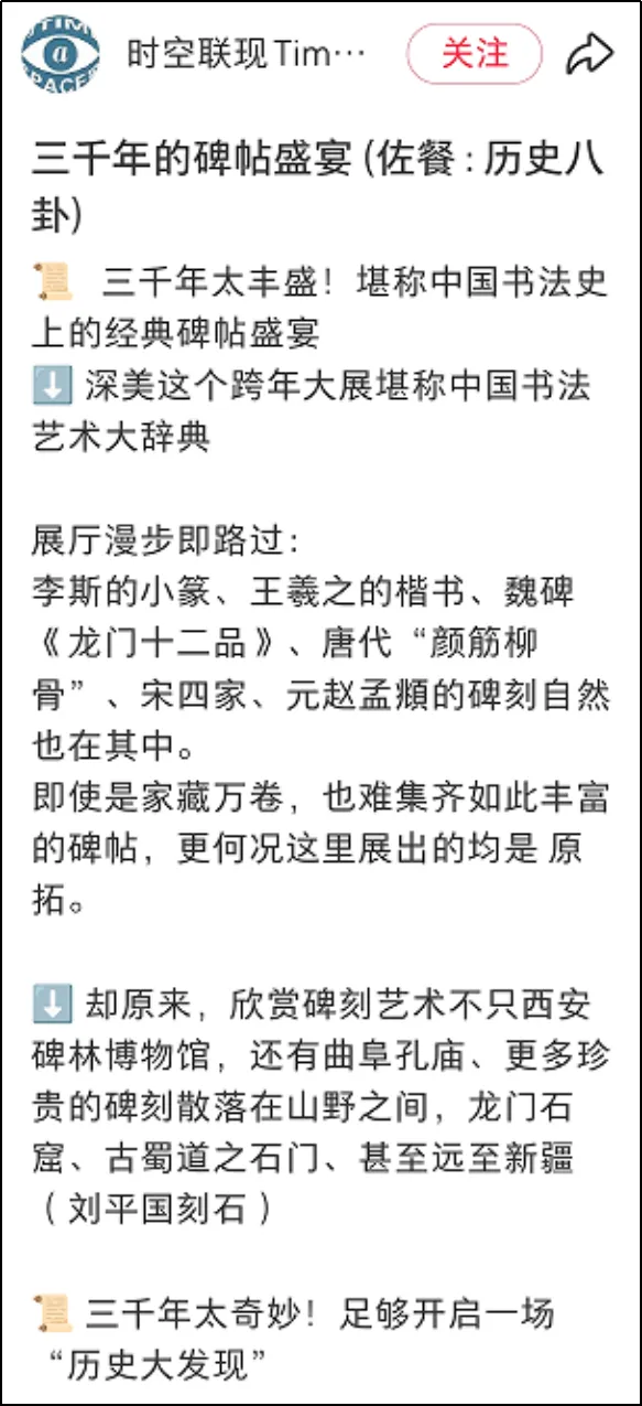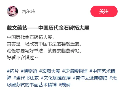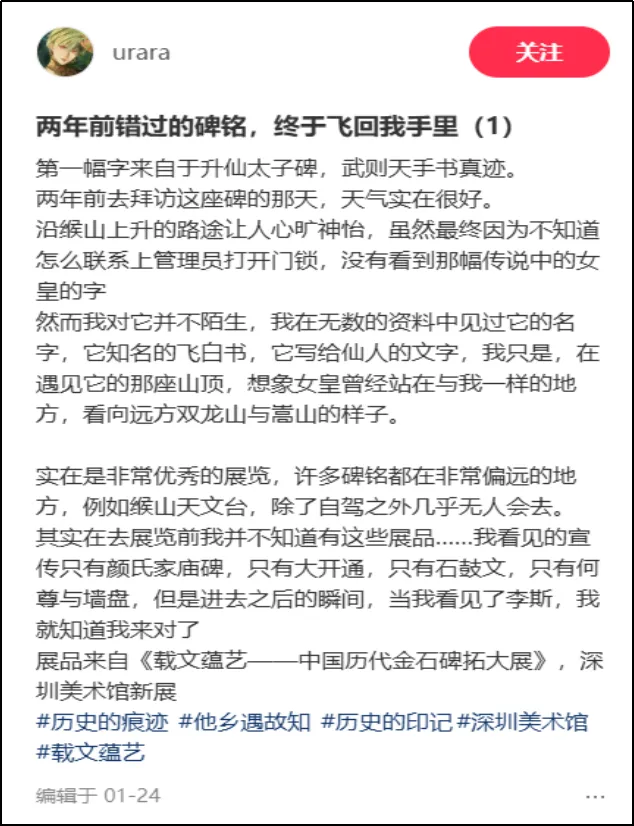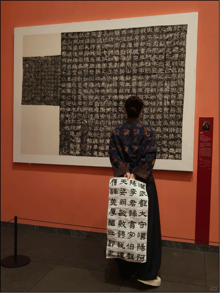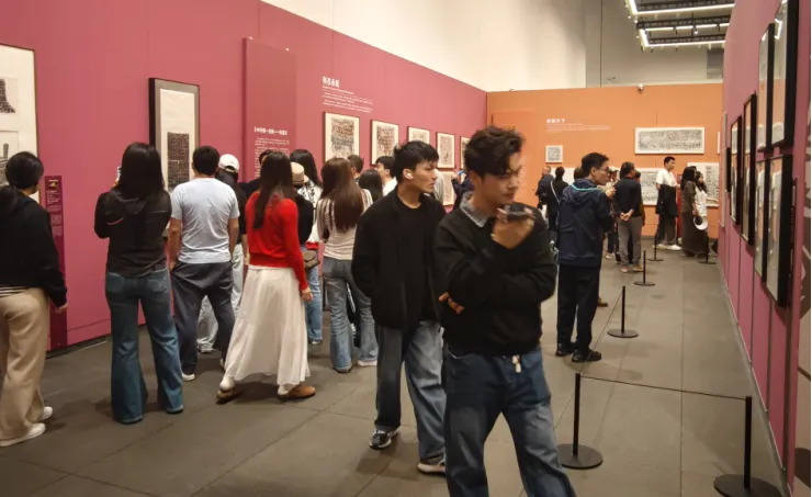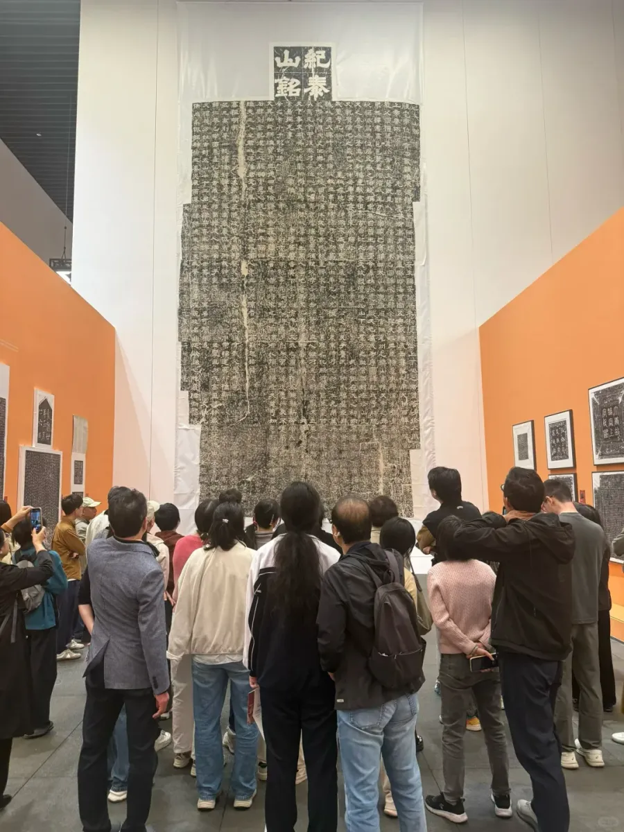 据不完全统计,在小红书平台上,关于深圳美术馆《载文蕴艺》展览的笔记多达数百篇,内容涵盖了展览介绍、参观攻略、拍照打卡等多个方面。许多用户不约而同地在笔记中特别提到了展览的震撼效果和文化价值,以及情感共鸣和观展体验。“全碑整幅拓本”也是本次展览的一大亮点,超过90%的展品以完整面貌呈现,年轻观众特别喜爱展览中的巨幅作品,尤其是《纪泰山铭》整幅拓本带来的视觉震撼。许多观众在社交媒体上分享了自己与巨幅拓本的合影,特别是年轻观众举着手机寻找最佳仰拍角度的场景,成为展览的一道独特风景线。