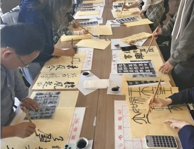 经典对临" 书法临摹活动作为《载文蕴艺》展览的配套活动,指导老师现场指导参与者临摹中国古代书法艺术经典作品,包括曹全碑、张迁碑、颜真卿《郭虚己墓志》、王羲之《平安帖》、颜真卿《刘中使帖》等。这种活动不仅让观众能够近距离接触经典书法作品,更通过亲手临摹的方式,深入理解书法艺术的技法和韵味。