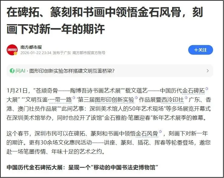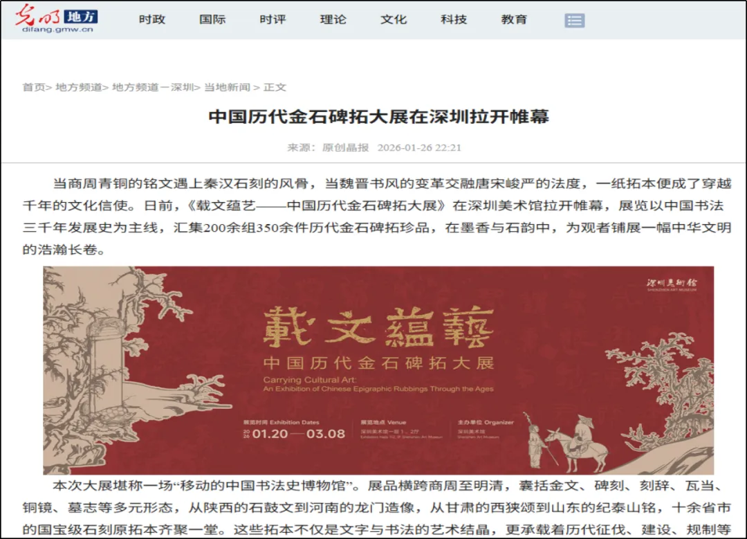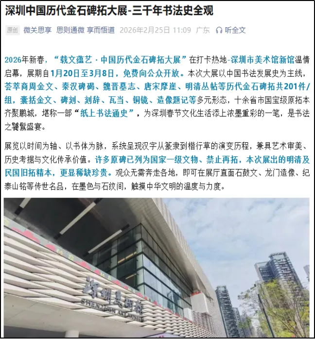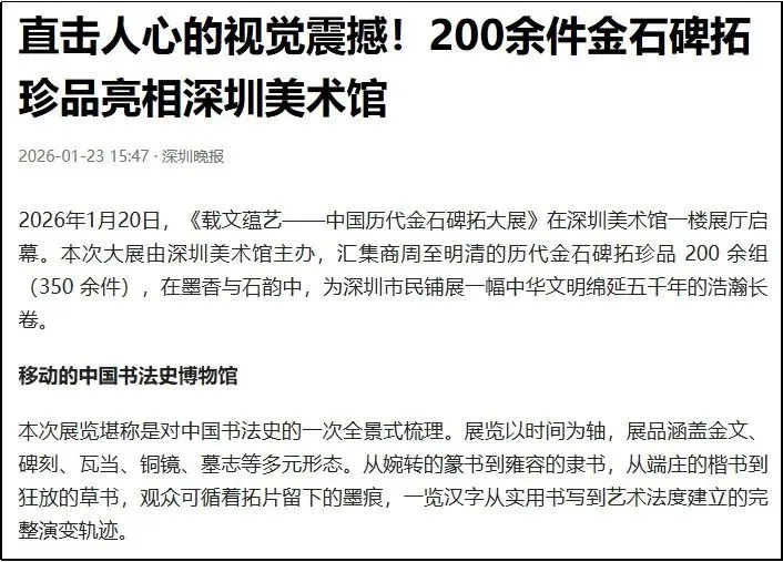 《载文蕴艺 —— 中国历代金石碑拓大展》于2026 年 1 月 20 日在深圳美术馆新馆一层 1、2 号展厅开幕,展期持续至2026 年 3 月 8 日,横跨整个春节假期,成为深圳市民春节期间重要的文化活动之一。