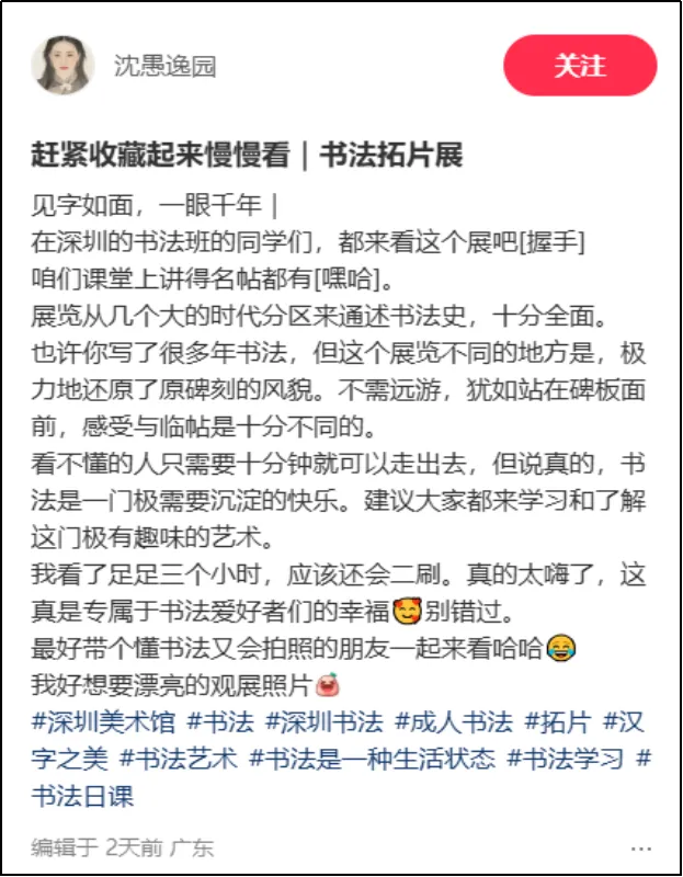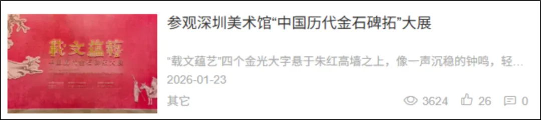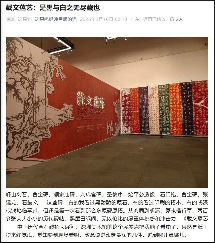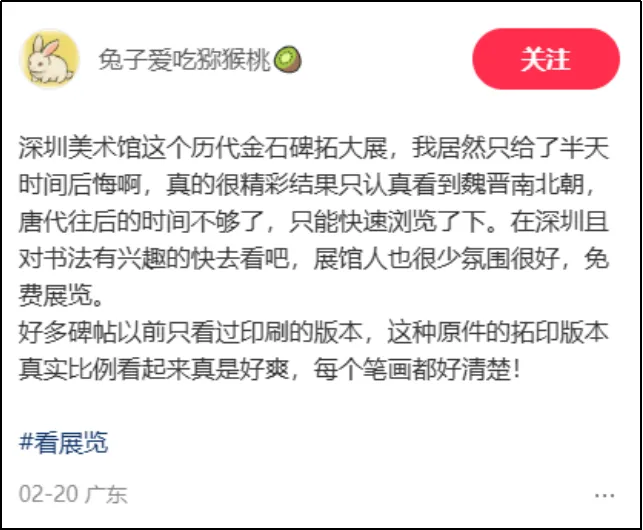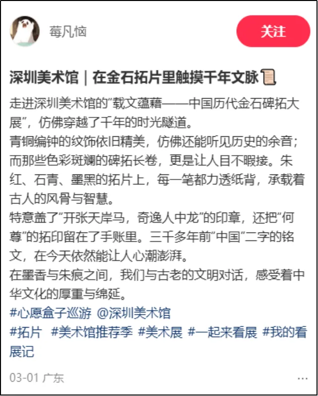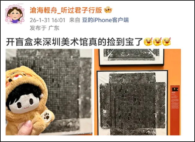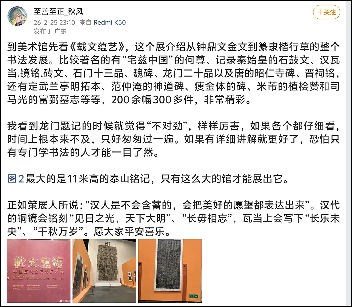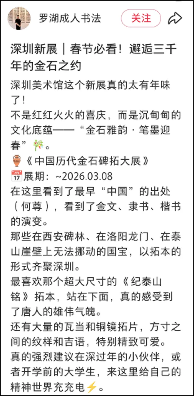 整体观展体验方面,有用户评论:“免费免预约,展品分量却重得吓人。何尊、石鼓文、牆盘、颜家庙碑……这是把半个中国书法史搬来深圳了吧?主办方太良心了!”类似评论将此次金石碑拓展视为深圳春节期间“可游、可赏、可触的文化盛宴”的重要组成部分,凸显其在市民文化生活中的重要地位。