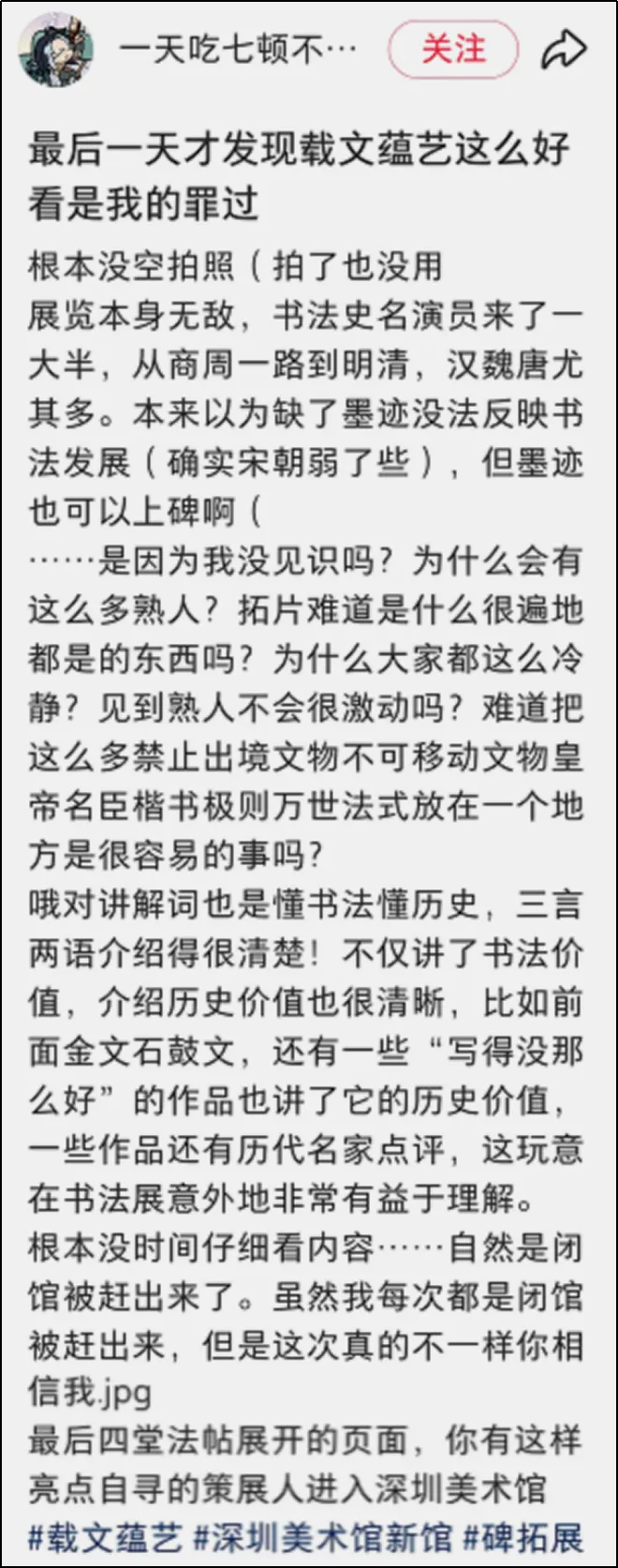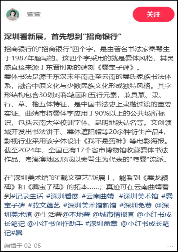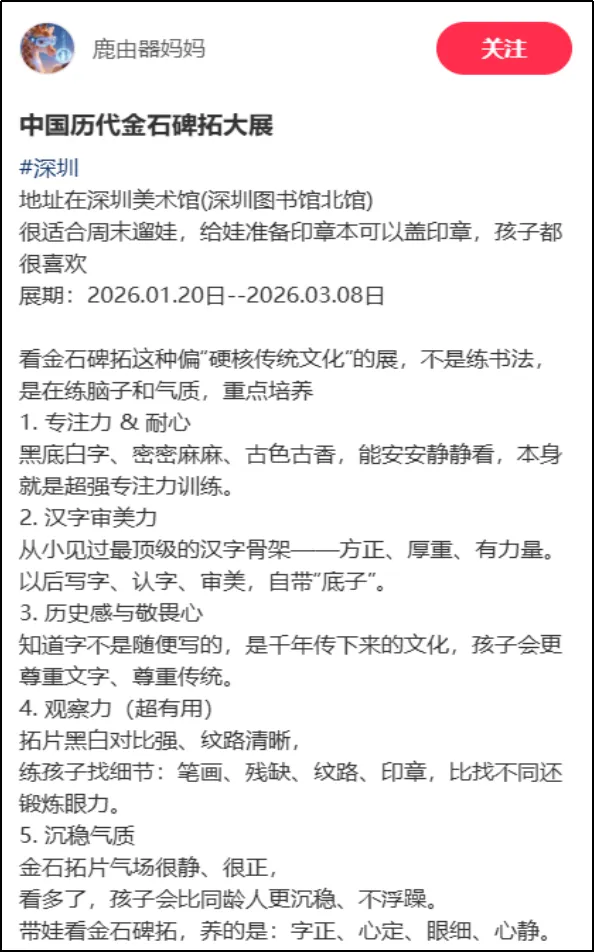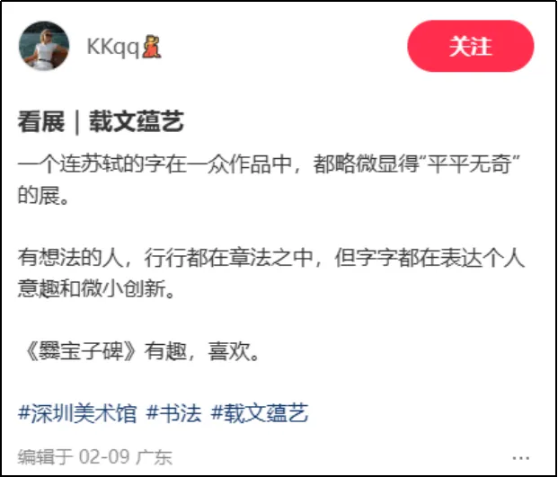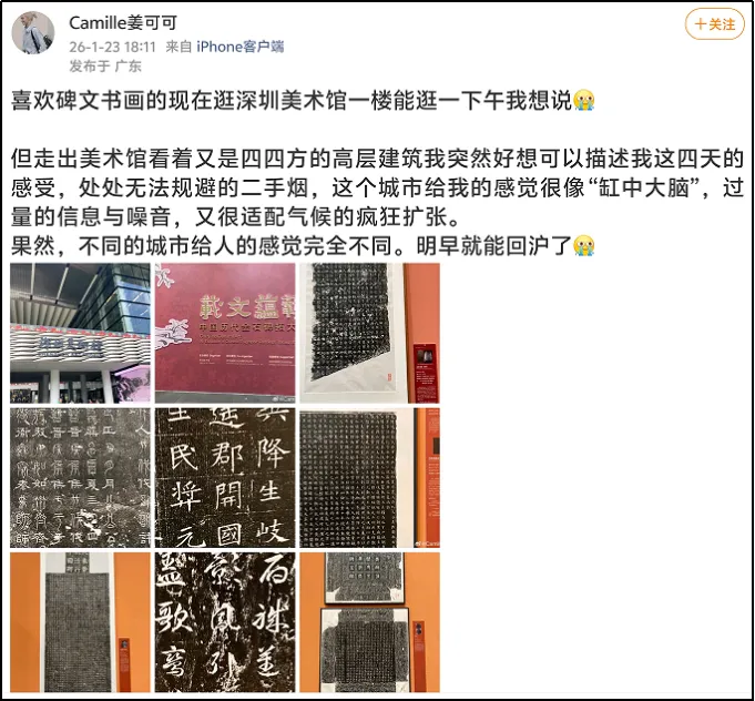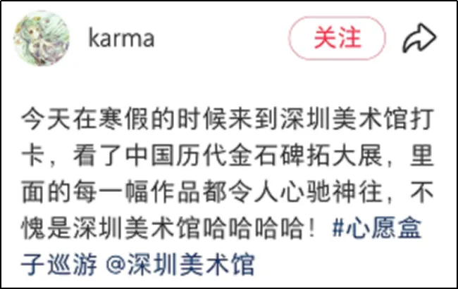 整体观展体验方面,有用户评论:“免费免预约,展品分量却重得吓人。何尊、石鼓文、牆盘、颜家庙碑……这是把半个中国书法史搬来深圳了吧?主办方太良心了!”类似评论将此次金石碑拓展视为深圳春节期间“可游、可赏、可触的文化盛宴”的重要组成部分,凸显其在市民文化生活中的重要地位。