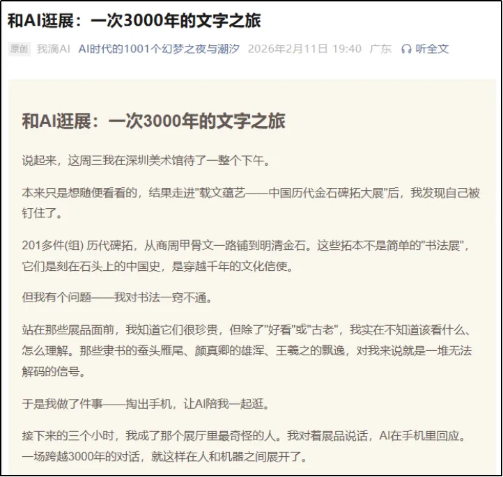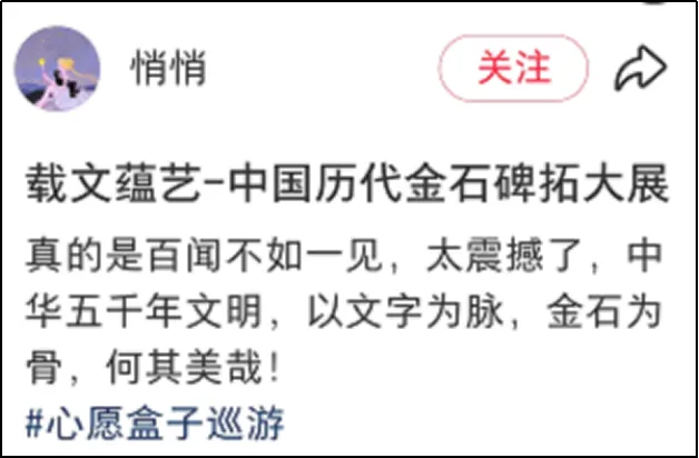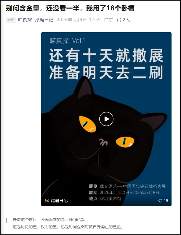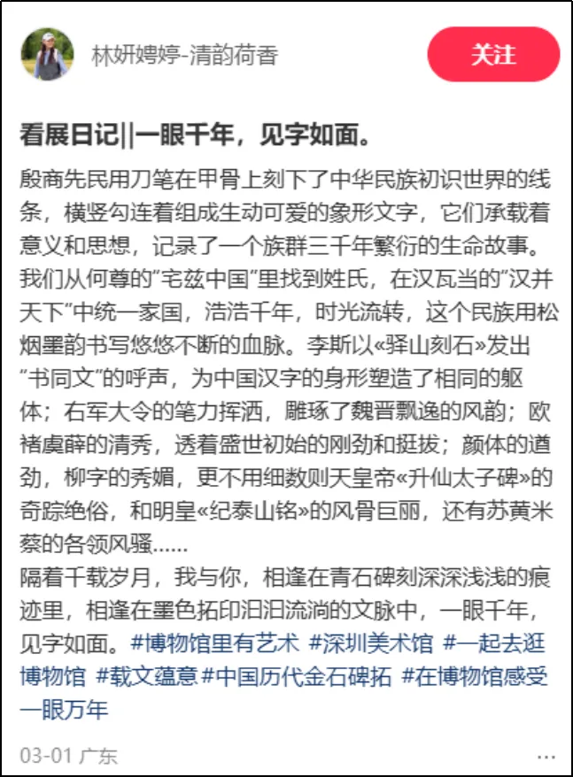 微信公众号和视频号的传播效果同样突出,太多观众不吝笔墨,自发在公众号中写有多篇关于本次展览导览的万字长文,既有体现专业深度的专家视角,也有教育工作者、金石爱好者、书法爱好者、文史爱好者、青少年及老年观众的视角,自媒体的传播效果凸显。而且微信公众号上的评论更具深度,不光有来自专业人士对展品和策展的认可,还有对深圳策展办展来自本土身份的认同,情感共鸣强烈。