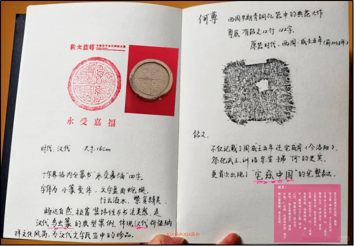 在商周时期的展品中,何尊铭文拓本无疑是最受关注的焦点之一。作为中国首批禁止出国(境)展览文物,这件青铜重器的铭文不仅具有重要的历史价值,更因为其中 "宅兹中国" 四字的出现,成为了中华文明史上的重要物证。牆盘铭文拓本则通过其记载的周王政绩,与《史记・周本纪》的内容相互印证,而关于微氏家族发展史的部分更是填补了西周国史的空白,被称为 "青铜史书"。
