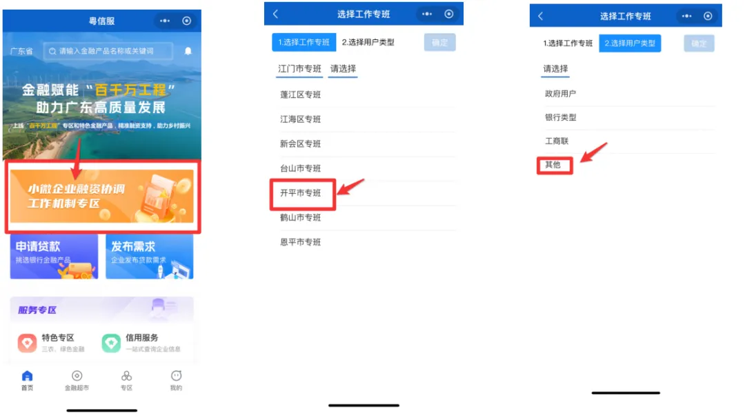 有明确融资需求的小微企业等经营主体,登录“粤信服”微信小程序进入小微企业融资协调工作机制专区,选择“开平市专班”,选择用户类型“其他”。通过微信扫描下方二维码,填报相关企业信息和资金需求,届时经过初审后的企业将直接纳入“申报清单”。