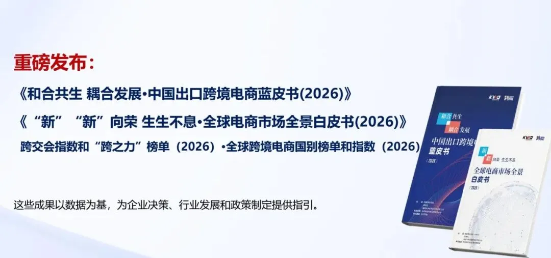此外,跨数据研究院将重磅发布多个专业研究成果,包括首次推出的“跨交会指数”(K-index)、“跨之力榜单”(K-Power Rankings),以及《中国出口跨境电商蓝皮书(2026)》等,为企业决策、行业发展和政策制定提供权威的数据指引。