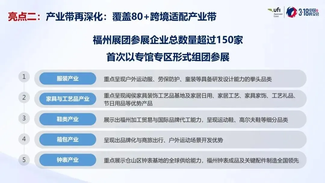 作为中国跨境电商的先行军,福州本地产业将在本次展会上迎来高光时刻。与往届不同,东道主福州首次以专馆专区形式组团登场,集中展示服装、家具与工艺品、鞋类、箱包、钟表等特色优势产业。这不仅是对福州制造业家底的一次集中检阅,更是推动“福州造”扬帆出海的重要举措。