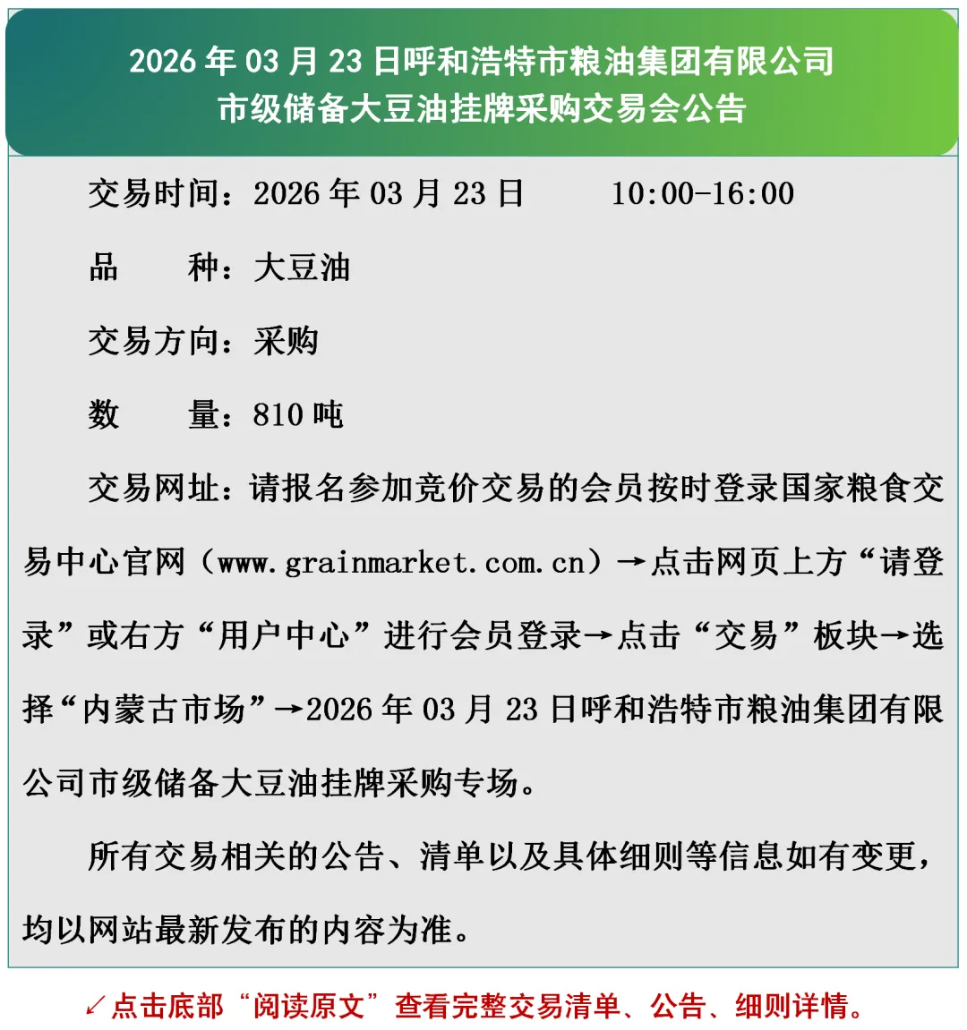 2026年03月23日呼和浩特市粮油集团有限公司市级储备大豆油挂牌采购交易会公告
