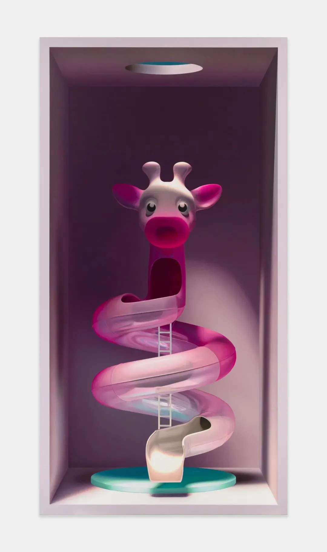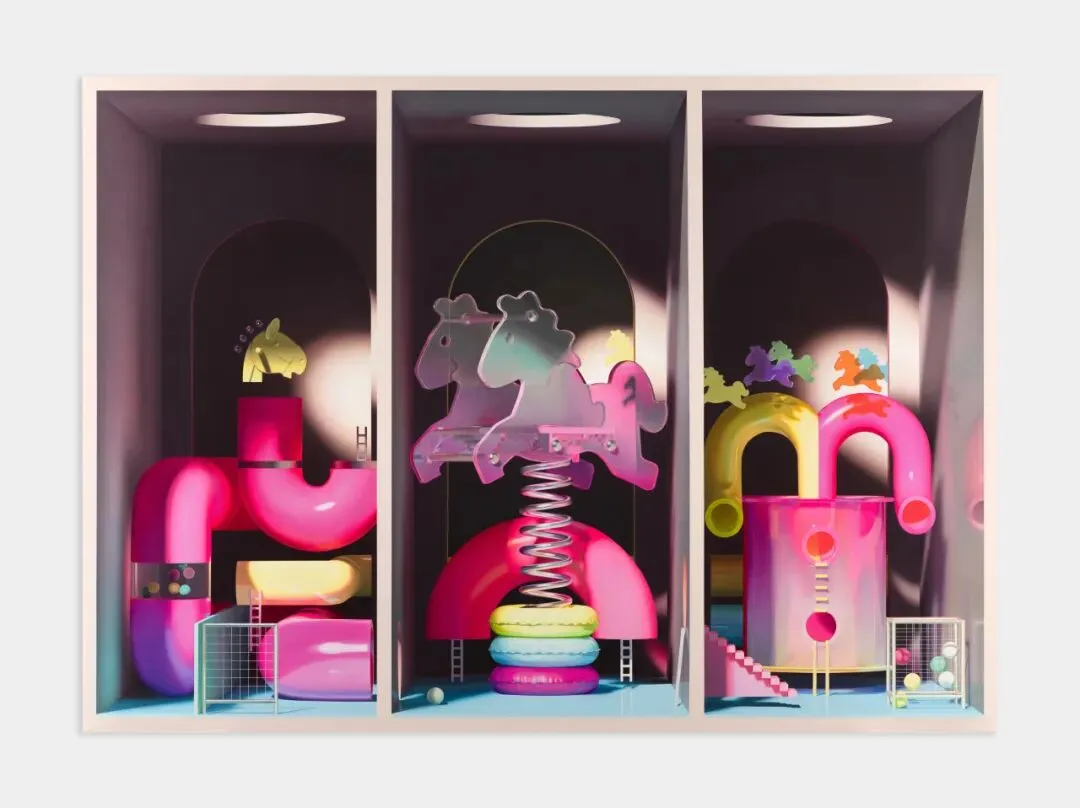 作为画廊于亚洲地区新近代理的艺术家,哈迪扬卢将呈现一系列以超写实游乐场景为主题的全新作品。色彩鲜明的滑梯、梯子与摇摇马构成迷宫般的结构,置身于由上方天窗照亮、空无一物的盒状室内空间,唤起失落童年与流离失所的联想。高度饱和的色彩、戏剧性的明暗对比与精确的透视结构构筑作品画面,将熟悉的物件转化为充满谜意的静物画面。