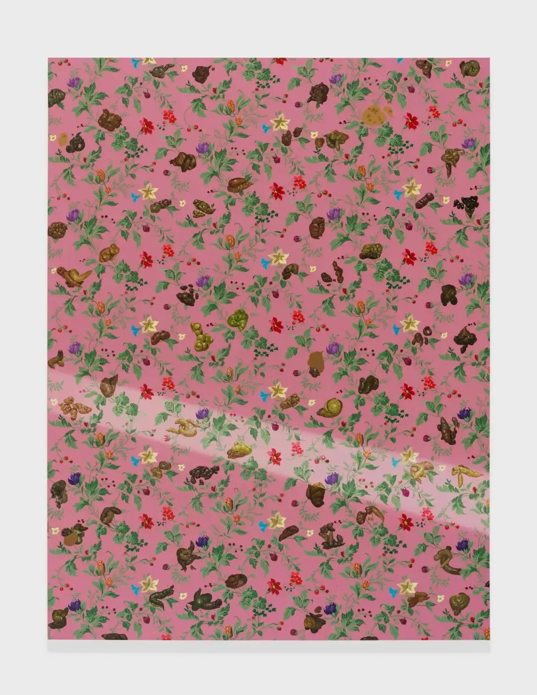 陈飞的《情诗》创作于女儿出生后,他借助“威廉·莫里斯”的方式,像墙纸画一样重新去装饰和排列女儿的便便,与此同时,一道光穿破整个画面,又使得形式感极满的画面瞬间充满了空气。