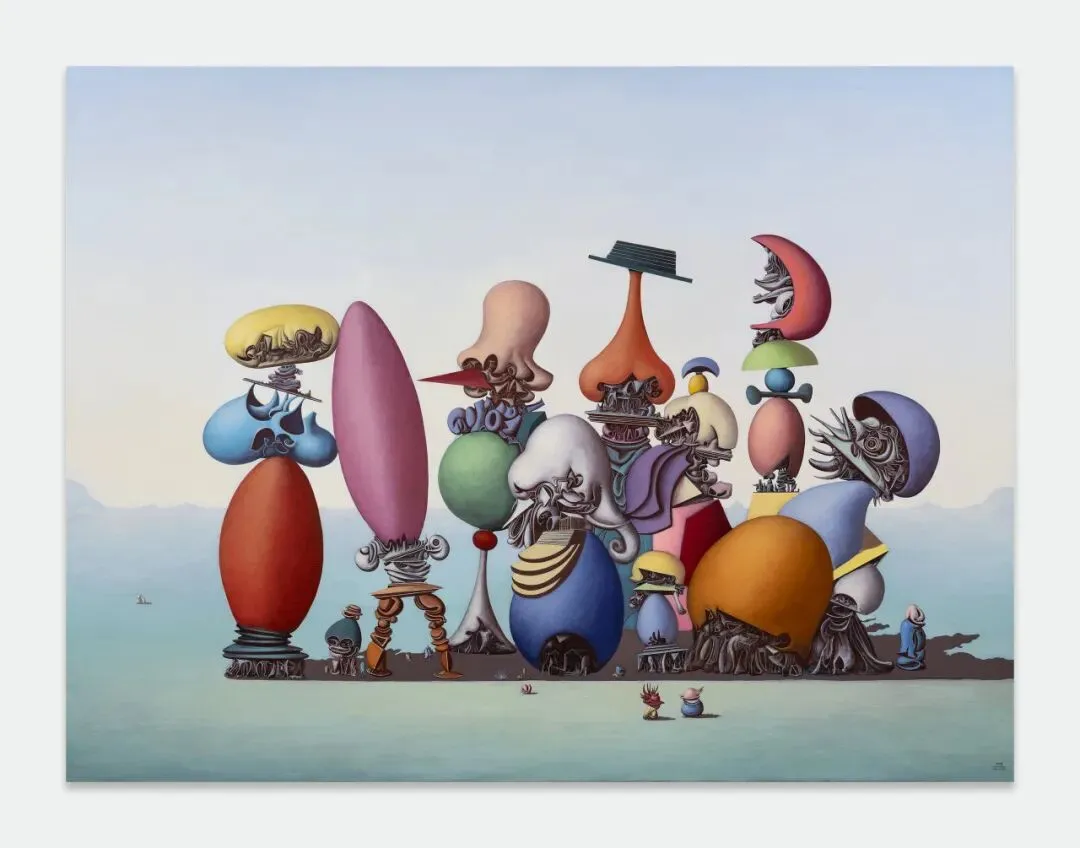 王梵僧带来作品《象鼻天舞》。他于画廊举办的首次个展“新世界”现正于贝浩登(上海)举行,展期至2026年5月23日。王梵僧的绘画创作横跨十余年,在中国山水与志怪传统之中嵌入难以归类的形态,这些形态徘徊于风景、生物与矿物之间,构筑出自成一体的世界,在其中,色彩、比例与空间间距取代叙事与象征,成为画面运行的核心原则。