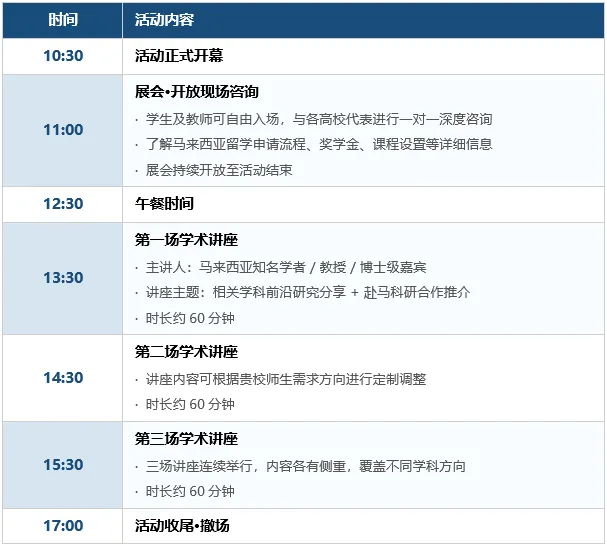 ✅与20所马来西亚高校招生官面对面沟通✅获取EMGS官方签证与申请指导✅聆听教授级嘉宾分享学术前沿✅一站式解决择校、选专业、留学规划所有问题