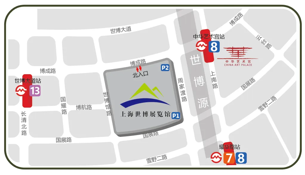 地铁:可乘1号线到人民广场站,换乘8号线至耀华站(4号口),步行7分钟到世博展览馆;约50分钟。