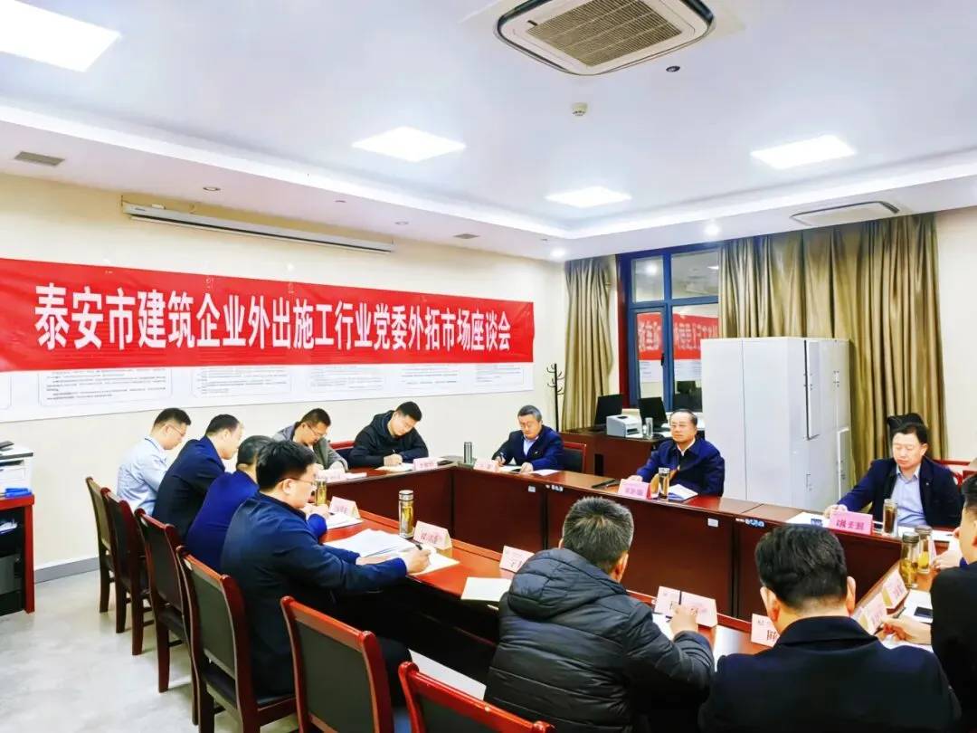 为深入贯彻落实省住房城乡建设厅以及市委、市政府关于坚定不移实施建筑业“走出去”发展战略、全面拓展省内、省外及海外三大市场的部署要求,泰安市建筑企业外出施工行业党委借助全省建筑企业外出施工行业党务工作者培训契机,组织召开外拓市场专题座谈会。省住房城乡建设厅党组成员、副厅长、一级巡视员,省建筑企业外出施工行业党委书记王润晓,省建筑企业外出施工联络服务站主任、省建筑企业外出施工行业党委副书记戚立强,省建筑企业外出施工联络服务站副主任冯鹏到会指导;市住房城乡建设局、市建筑业发展中心、各县市区建设主管部门负责同志及部分建筑业骨干企业代表共20余人参加会议。