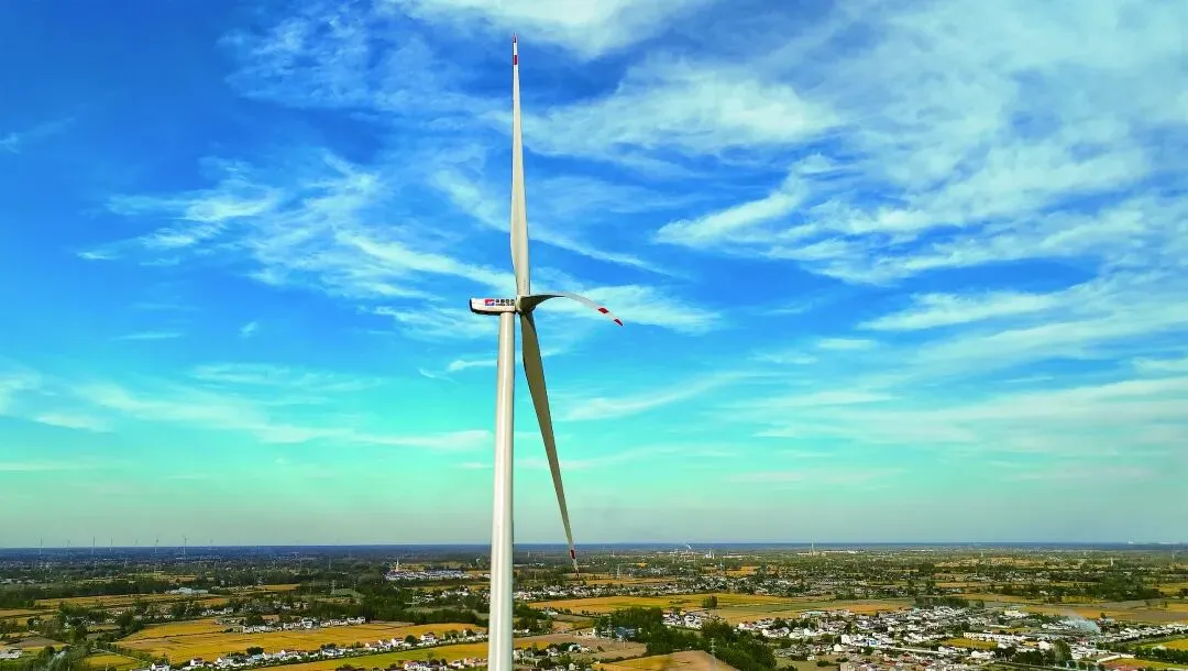 在苏北平原上,一座座180多米高的白色风机迎风转动,风机叶片采用巨石玻纤制造,发出的绿电源源不断输送至生产基地。这是基地配套建设的风电项目:一期233兆瓦项目已并网运行,47台机组年发电量超6亿千瓦时,实现碳减排超40万吨;二期500兆瓦项目建成后,年发电量预计达12.4亿千瓦时,年减碳100万吨,相当于植树约900万棵。基地真正实现了从“生产玻纤”到“使用玻纤”再到“绿能回馈玻纤”的绿色循环。