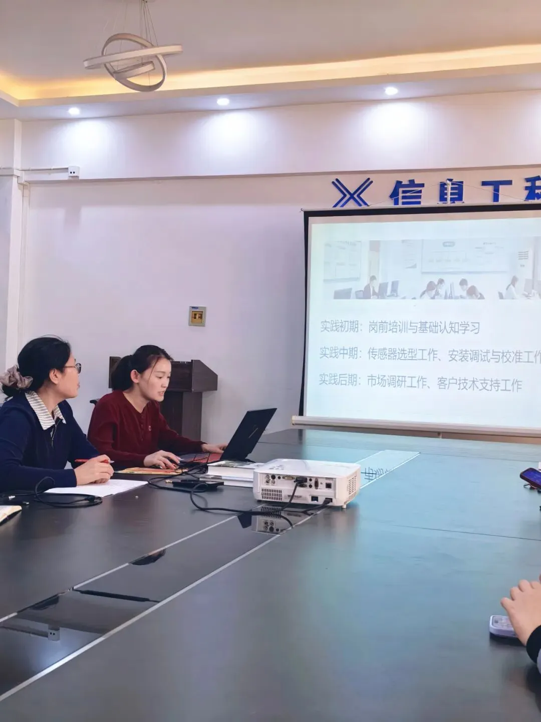 汇报中,孙守英教师围绕实践单位概况、岗位职能、实践过程及成果收获四大方面展开详细阐述,分享了为期八周的实践全过程,从初期的岗前培训与基础认知学习,到中期深度参与传感器选型、安装调试等项目实操工作,再到后期开展客户技术支持,完成了从理论到实操的能力转化。在成果展示环节,孙守英教师介绍,此次实践不仅大幅提升了自身专业实操能力与业务认知水平,更依托企业真实项目场景,提炼出多个贴合通信专业的毕业设计题目,实现了实习实践与专业教学的有机衔接。