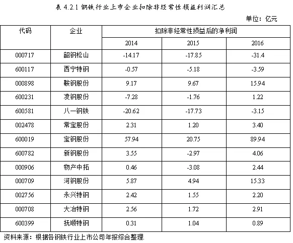 本文将从各个钢铁行业上市企业年报中提取、加工整理各企业2014年-2016年扣除非常性损益后的利润进行筛选。