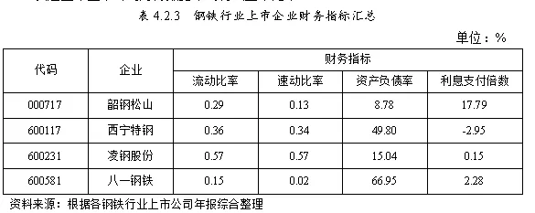 由表4.2.2及4.2.3综合得出,流动比率中,四个企业均出现资产流动性不足情况;速动比率看,韶钢松山(000717),西宁特钢(600117)、八一钢铁(600581)存在企业短期资金困难情况;资产负债率来看,西宁特钢(600117)、八一钢铁(600581)存在较严重负债情况;利息支付倍数来看,西宁特钢(600117)、凌钢股份(600231)偿债压力大,其中西宁特钢(600117)偿债危机出现。由此可识别出西宁特钢(600117)、八一钢铁(600581)为符合第二标准的企业。