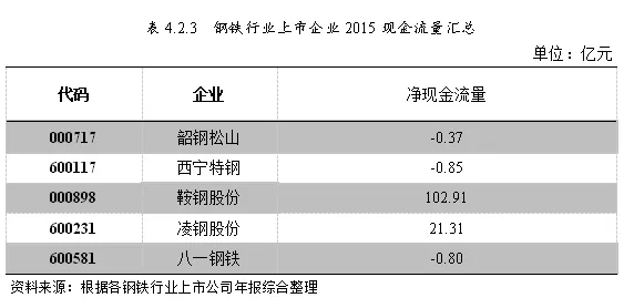现金流量为负数即为符合第三标准企业。以2015年为例,根据上市公司年报,细分为经营活动现金流量、投资活动现金流量和筹资活动现金流量形成最终净现金流量,具体分析如下表: