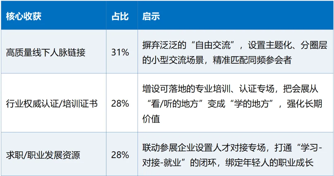 调研数据清晰地呈现了Z世代对展会价值的排序,也大概能推翻“线上能替代线下”的认知: